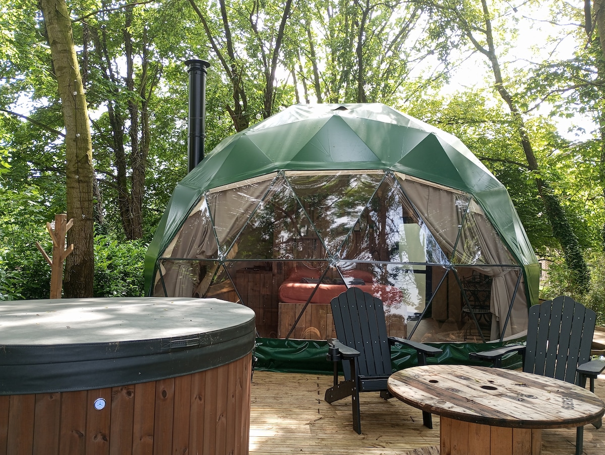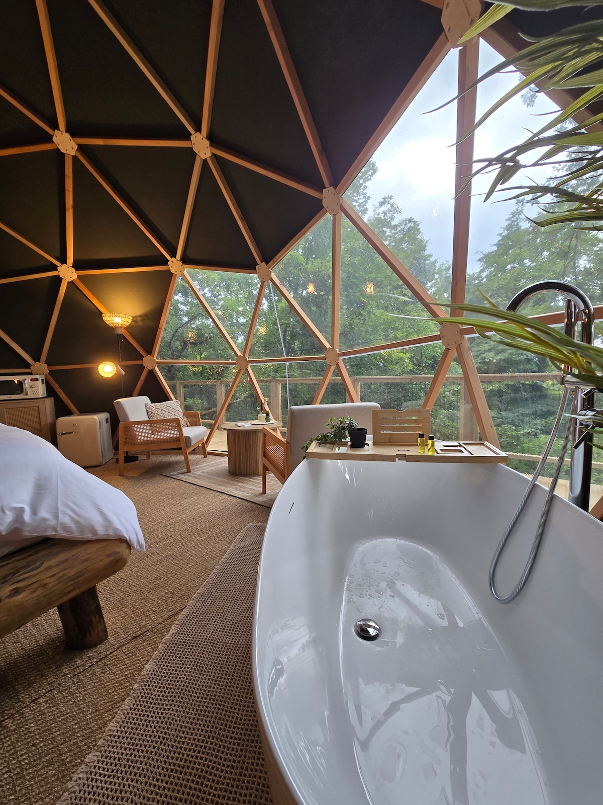 Évadez-vous dans notre dôme bohème en pleine nature. Un cocon chaleureux pour une pause hors du temps. Profitez d’un grand lit king size, d’un coin détente et d’un jacuzzi privatif sur la terrasse pour une expérience unique au cœur de la forêt. En option un petit-déjeuner à 15€/personne livré sur la terrasse et bouteille de champagne à 45€ pour sublimer votre séjour.