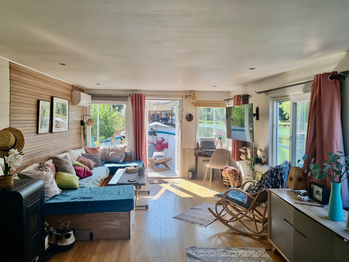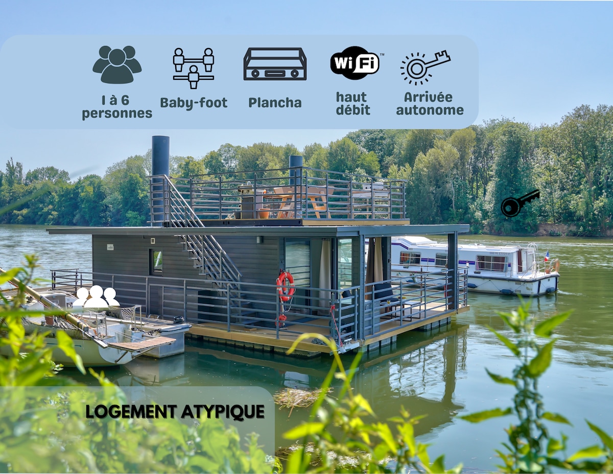 Looking for an unusual getaway just 30 minutes from Paris? Welcome aboard the House-Boat: a floating haven where the water gently rocks you and the view of the Seine offers a truly timeless experience. Enjoy the rooftop terrace for barbecue evenings, play foosball, and create unforgettable memories with family or your loved one (Romantic Package available). Also discover a charming town center with restaurants, terraces, and shops. Book now and experience life on the water!