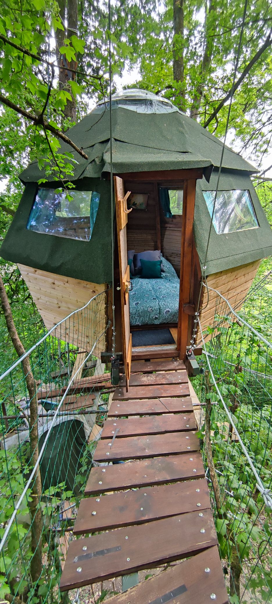 Pour un moment unique perché à 6 m dans les arbres, accessible par un escalier de meunier. Un nid douillet et cosy vous attend au bout d'un pont suspendu, pour une immersion totale dans les arbres. Une parenthèse féerique dans l'univers des farfadets bercé par le chant des oiseaux. Vous trouverez une dépendance avec un coin cuisine, lavabo et toilettes sèches. Bain nordique en supplément 50€. uniquement sur réservation selon disponibilité.