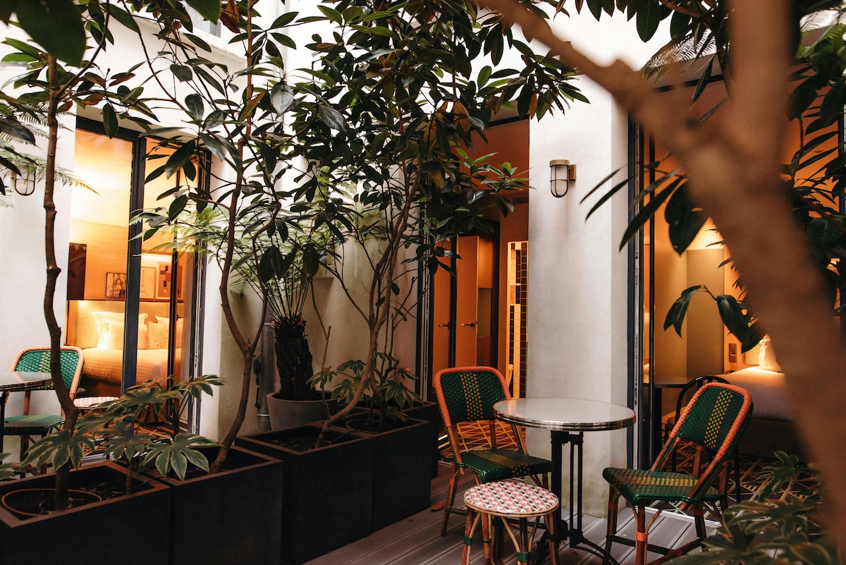 Welcome to the Alpha Hotel where the Eiffel Tower is honoured with a unique decoration: photographs, portraits, engravings and other surprising details immerse you in the Parisian atmosphere of the late 19th century. Stay in one of our "Eiffel" rooms, in the heart of Boulogne-Billancourt, in a quiet and peaceful street, close to the metro line 9 and a 10-minute walk from the Parc des Princes. During the day, our flowered patio offers you a "nature break".