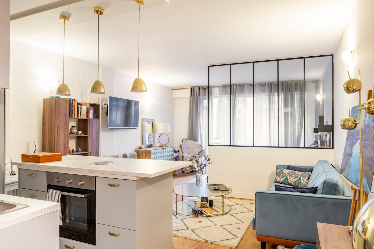 In the very heart of the Rue Saint Honoré "Carré d'or", (Place Vendôme, Colette, Costes, Vuitton...). 45 M2 Loft fit for up to 6 people. 2 lits Queen-size beds (10,5 inch thick mattresses). 1 Sofa-bed 2 persons. Movable partitions. Bathroom with shower. Fully equipped kitchen. Induction hobs. Nespresso coffee machine. Washing machine. TV HR 50 inches Free Wi-Fi City tax to be paid on site in cash only : 1€/pers/night