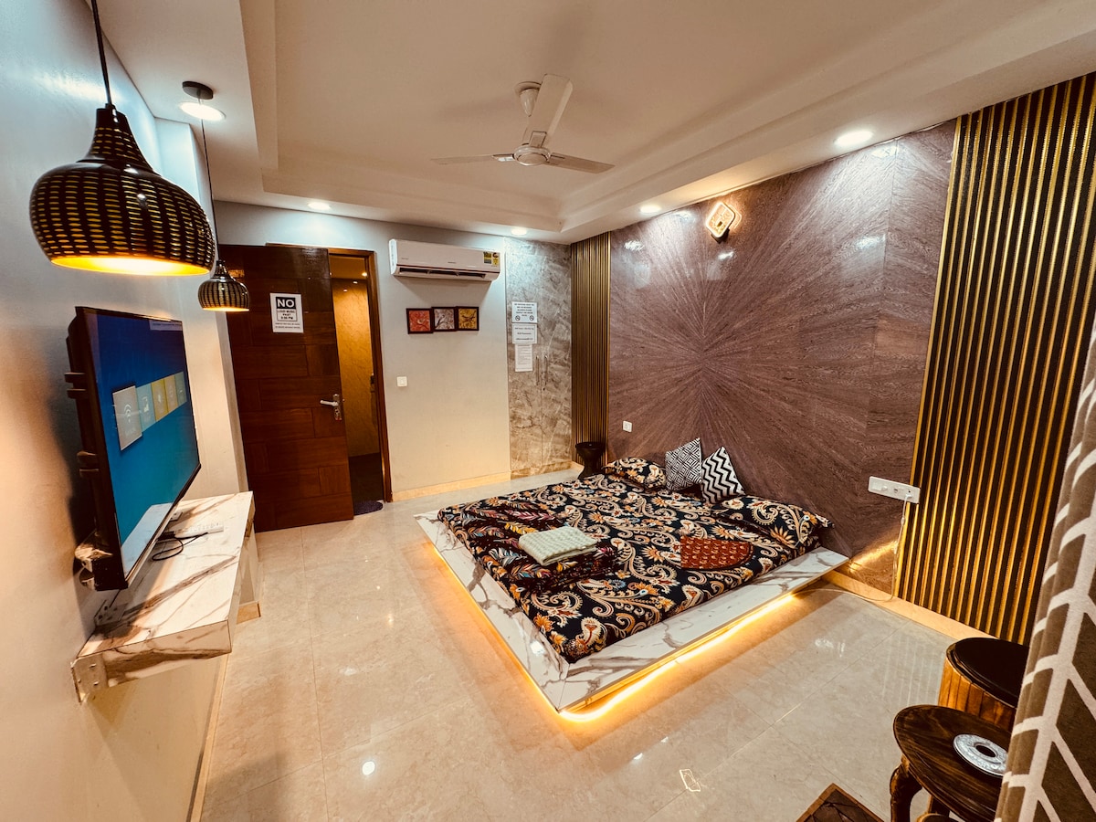 Indulge in the epitome of sophistication in this luxury studio apartment in the heart of South Delhi in Saket. Nestled in a prime location, Enjoy a tastefully furnished space, complete with luxurious decor and ample natural light. With a King Size Bed, Large screen 43" Smart TV, Fully functional pantry and a stylish washroom, every detail caters to a refined lifestyle. Immerse yourself in comfort & convenience. Welcome to a blend of luxury and urban living