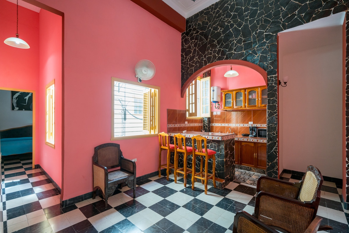 Apartamento con ubicación privilegiada en el centro histórico de La Habana. A solo 50 m de la Bodeguita del Medio y cerca de la Catedral, Capitolio, Floridita y museos. Zona segura, ideal para caminar y rodeada de buenos restaurantes y bares. Ofrecemos servicio de taxi con costo adicional para traslados dentro o fuera de la ciudad. El apartamento es totalmente independiente y reservado solo para el huésped.
