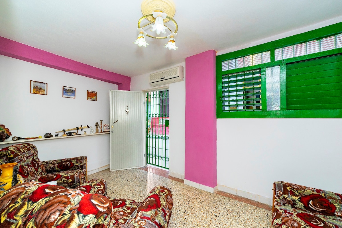 Independent ground floor apartment, very close to the Malecon and the Plaza de la Revolucion, fully air-conditioned, has 1 bedroom with its respective bathroom with hot and cold water. Air conditioning, TV, Minibar, Safe and Clothes iron are some of the benefits of our rooms. In the kitchen we have a double temperature refrigerator, washing machine, gas stove, electric coffee maker, electric kettle and other utensils. Ideal apartment for couples or single people.(No blackouts in our area)