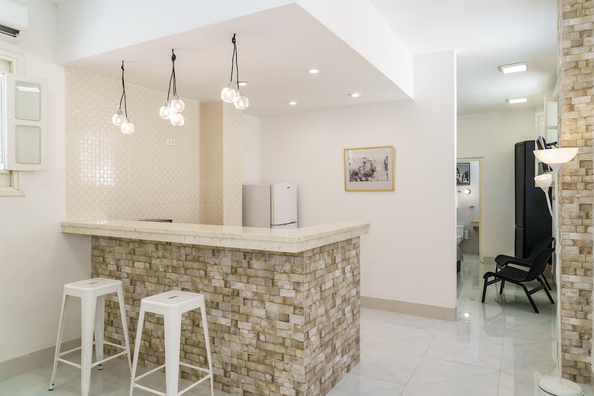 Te ofrecemos un apartamento tranquilo en el centro de La Habana, cercano a la mayoría de sus lugares emblemáticos, a los cuales podrás ir caminando. Hacia la derecha, en 15 min estarás en Habana Vieja, el casco histórico de la capital. Si te diriges hacia la izquierda, en 10 min llegarás al Vedado, zona de clubes y bares que no te debe faltar visitar de noche. Yendo hacia el frente, en 5 min te toparás con el famoso Malecón habanero, donde podrás disfrutar de un atardecer inolvidable.