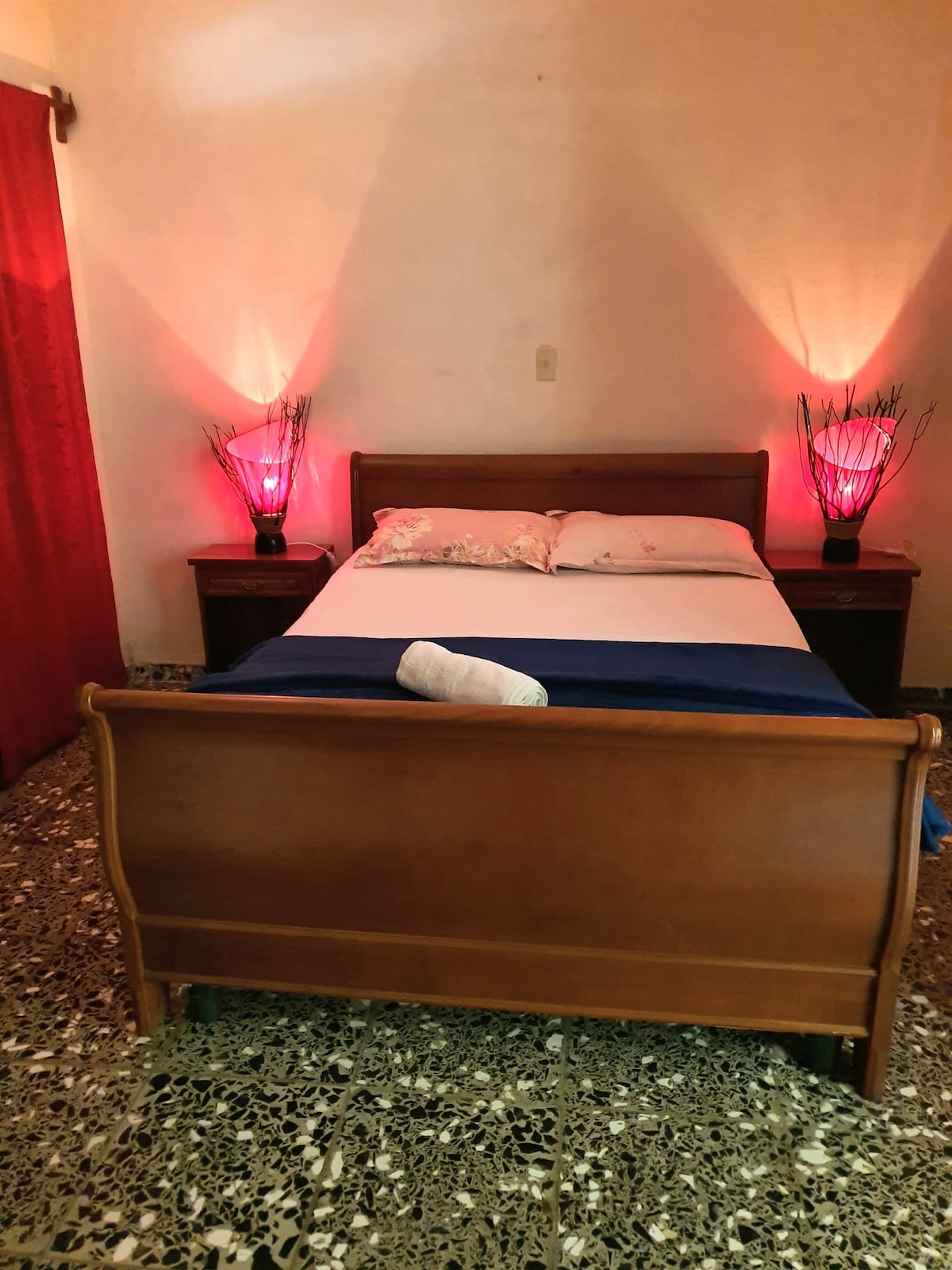 House / guest house with separate entrance, in a residential area, 14 minutes from downtown by car. Ideal for families, honeymoon and groups of friends. Own telephone, refri, hot / cold water, two rooms new a/c: 1st-double bed and 2nd-two beds, a bathroom, living room, kitchenette; access to terrace and tropical garden. Hostess at your disposal 24 hrs/day speaks English. Casa de invitados de entrada independiente, en zona residencial a 14 minutos del centro en coche. Anfitriona habla inglés.