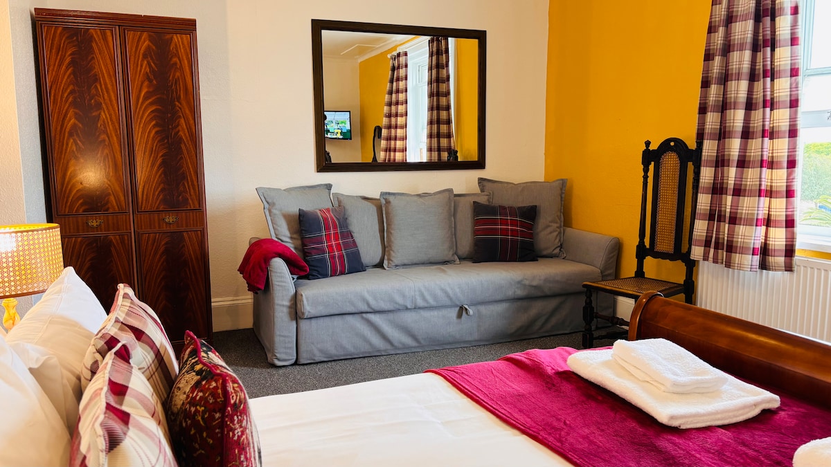 Room 8 is a bright and welcoming space located on the 2nd floor, featuring a large window that overlooks Southsea Rock Garden. It features a king-size bed, a large sofa bed that extends to king-size, and a private en-suite with a shower. A communal kitchen is available one floor above, while the lively music pub below serves drinks and meals in a friendly atmosphere. Offering comfort, convenience, and stunning views, Room 8 is perfect for travellers seeking independence and vibrancy.