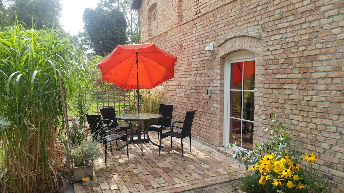 Die Ferienwohnung ist in einer 120 Jahre alten Backstein-Remise. Sie hat freien Blick nach Süden ins Havelland. Im Erdgeschoss ist eine Wohnküche mit Schlafsofa, Terrasse und eigenem Garten. Im ersten Stock das Schlafzimmer, ein Balkon mit Panoramablick und das Badezimmer mit einladender Dusche. Fläche (ohne Aussenanlagen): 40qm Bettwäsche und Handtücher sind im Preis inbegriffen. Das anliegende Loft (45 qm) kann dazu gemietet werden. Dort können 3 weitere Personen unterkommen.