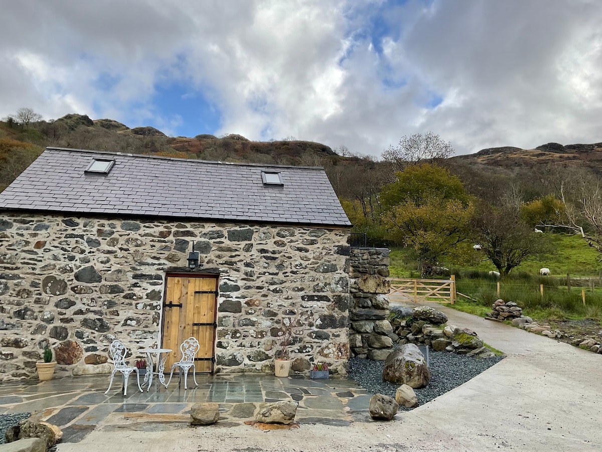 You're assured a warm welcome to this beautifully restored small barn, now a cosy cottage with exclusive use of all year round hot tub! Stunning location bordering Snowdonia (10 mins walk to Park). On clear days Snowdon, Yr Wyddfa, herself is in full view. Free Electric car charge. Close to castles, Llyn Peninsula, much beautiful coastline, stone's throw from Anglesey & more! Suitable for couples/one individual. Come, pamper yourself on a restorative break, explore a glorious area, North Wales!