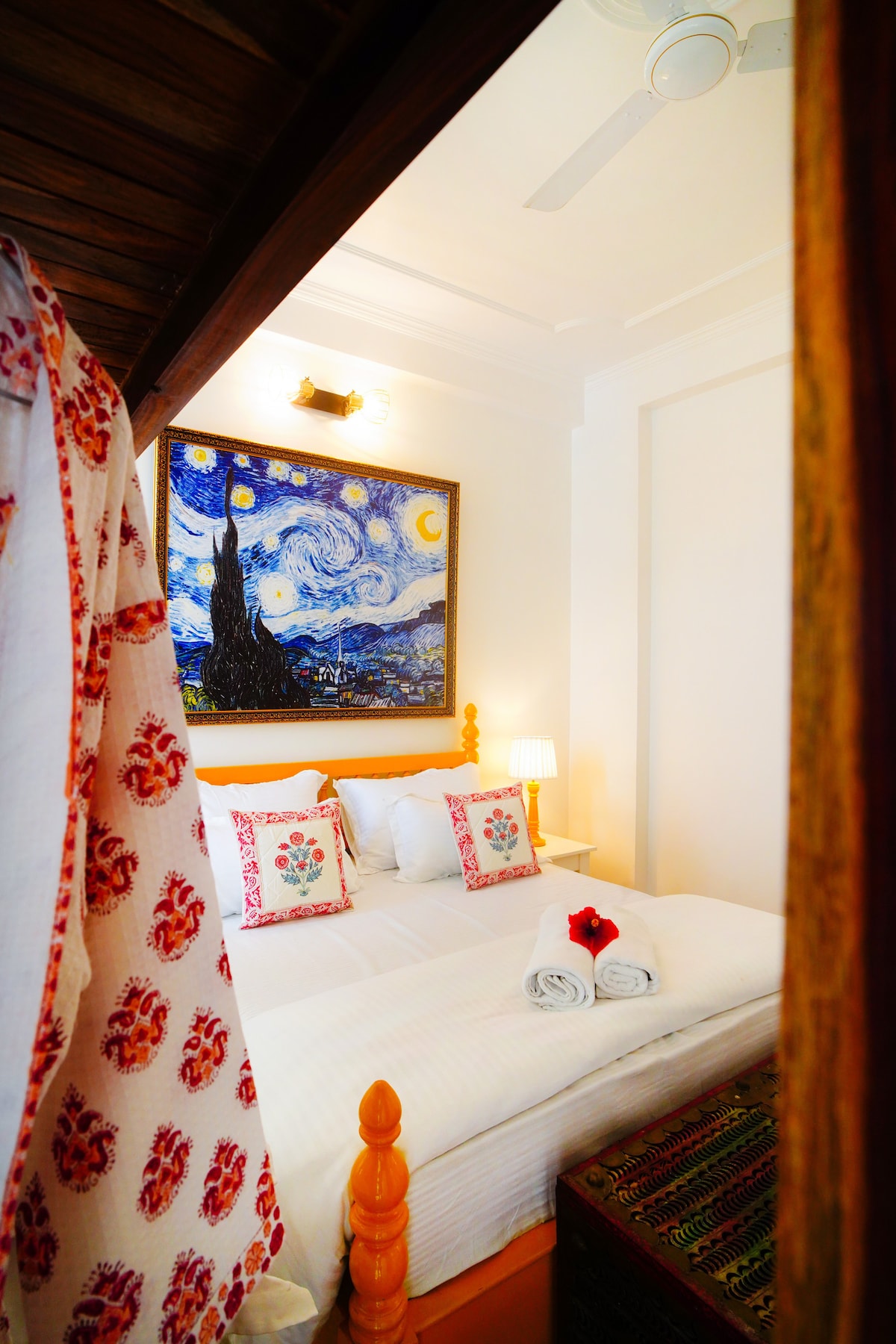 "The Golden Door" is an artistically designed room with an attached bathroom on a private terrace with panoramic views of the Aravali Hills. Ideal for couples, solo travelers, and business professionals, this accommodation seamlessly blends aesthetics and functionality. Its central location grants easy access to major attractions. In essence, "The Golden Door" transcends conventional stays. With its central location, artistic design, and comfort, it provides a simple yet unique stay.
