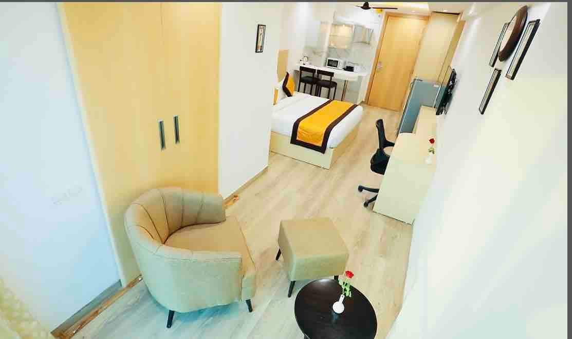 The Casa99 Premium Suite offers a luxurious and spacious retreat, featuring a comfortable bedroom. The suite is equipped with soft sofas for relaxation, an attached modern bathroom, and a fully equipped kitchen with essential appliances like a stovetop, fridge, and cookware. With elegant decor, ample space, natural light, complimentary Wi-Fi, and air conditioning, the Premium Suite ensures a refined and comfortable stay.