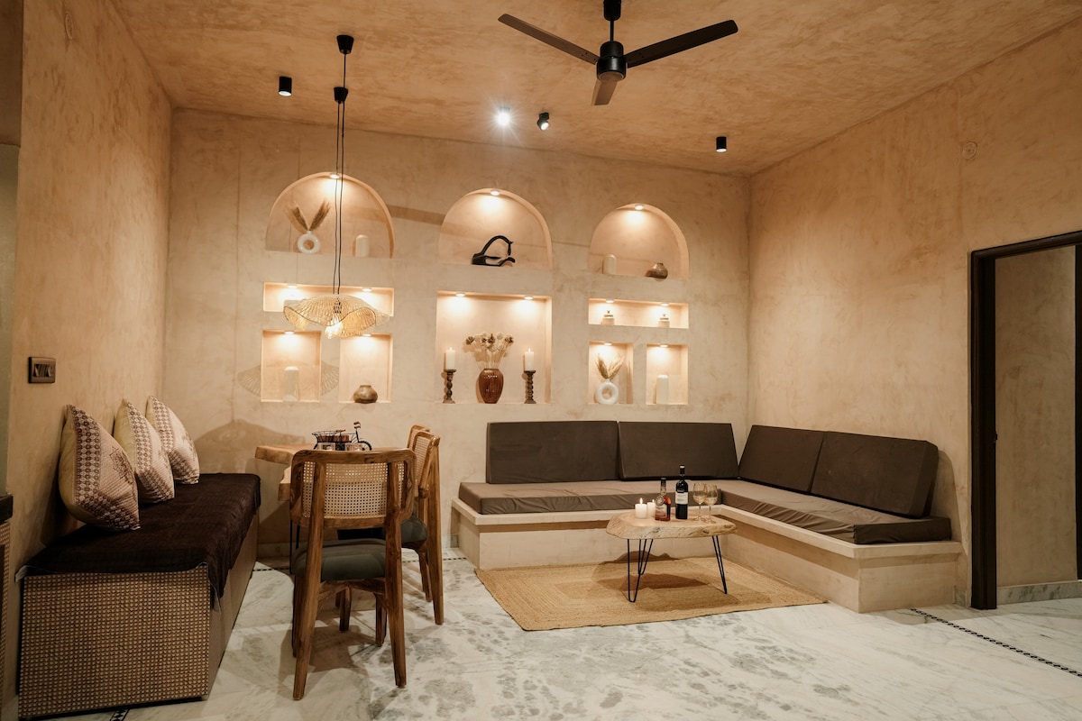 "The Golden Door" is an artistically designed room with an attached bathroom on a private terrace with panoramic views of the Aravali Hills. Ideal for couples, solo travelers, and business professionals, this accommodation seamlessly blends aesthetics and functionality. Its central location grants easy access to major attractions. In essence, "The Golden Door" transcends conventional stays. With its central location, artistic design, and comfort, it provides a simple yet unique stay.