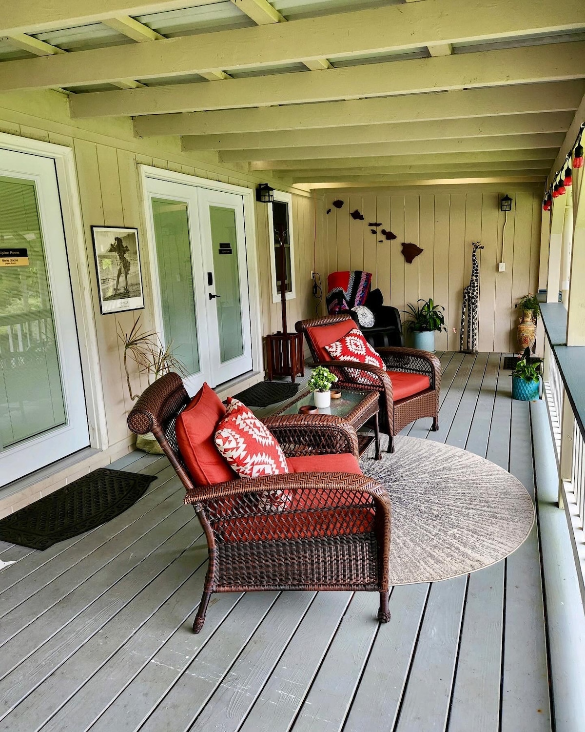 The Nene Suite has a king bed plus additional thick pull-out sofa chair bed in spacious 330 sf room. Private entrance with door codes. The room opens up to a large shared lanai. The kitchenette includes microwave, mini fridge, Keurig coffee, pods, teas, sugar, creamers, utensils and a few essential spices.. Guests are offered complimentary breakfast items in fridge for 1 morning. No Host owners live in private dwelling on property.