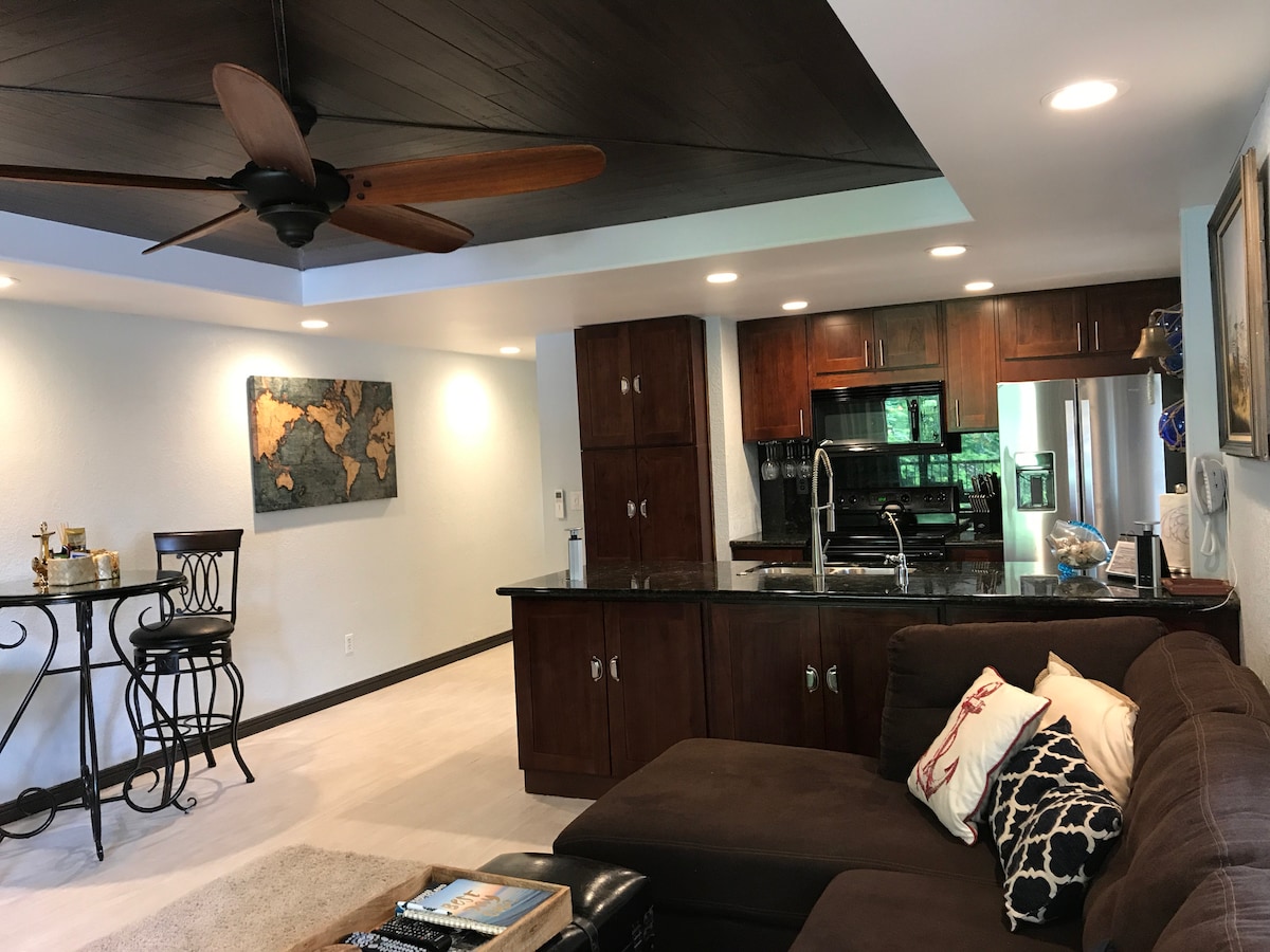 Located conveniently 5 minutes from the airport and a short 15 min drive to downtown Kailua Kona. Vaulted ceilings, a cute lanai to enjoy your morning coffee, large bathroom with double vanity, and a kitchenette make this rental a real gem. The AC is powerful for when the tropical breeze isn't quite cool enough, The WIFI is reliable and there is a large screen TV with ROKU for when you just want to hang out. We offer automated check in, excellent room amenities and flexibility with booking.