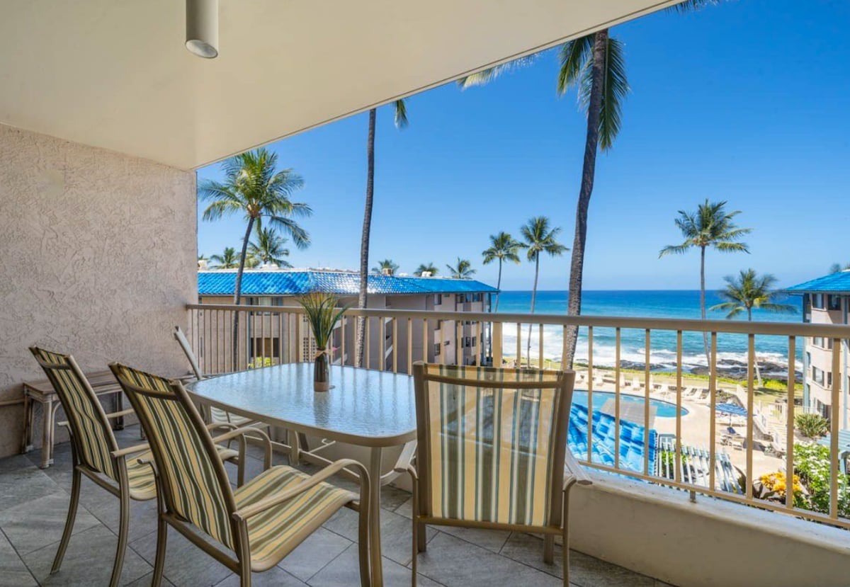 The Kona Reef is being renovated in 2026. Check out our special construction rates. Reno hours 8a-5p Mon-Sat while you are out at the beaches, volcano etc. You’ll love this condo! Absolute Ocean Front. 5 minute walk to downtown. Free parking! Completely remodeled! Fresh, clean, stylish & comfortable. NEW Full A/C, Stocked Kitchen & Beach & Golf Equipment. ATTENTION GOLFERS! 2 sets of Callaway Clubs! Check out our 2 other Kona Reef condos A35 & B31 TA-109-936-6880-01 STVR-19-352037