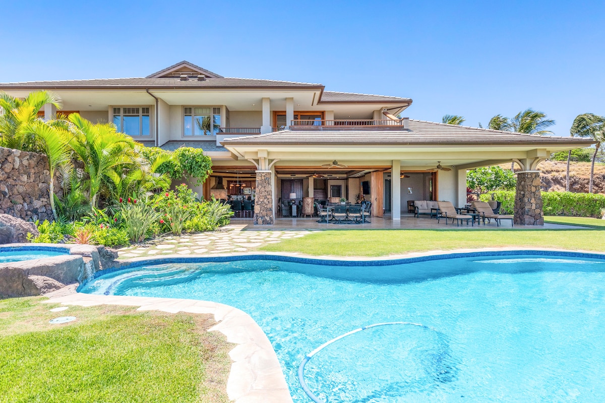 Welcome to Hale Mele, a luxurious 4,000 sq/ft Polynesian-style retreat in the gated Champion Ridge community on Kohala’s sunny "Gold Coast." This single-story home features 4 private bedrooms, 5 full baths, 2 half baths, and 2 outdoor showers. Relax in the private heated saltwater pool and spa, enjoying unobstructed Mauna Kea views. Perfectly located in a premier Big Island resort, this elegant haven offers unparalleled comfort and exclusivity. Hale Mele: your private paradise in Hawaii.