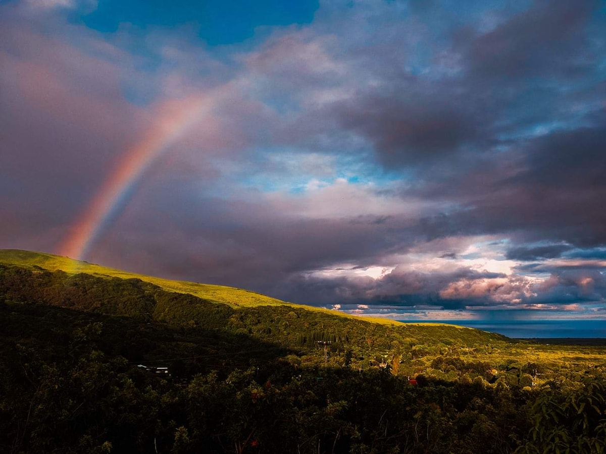 Welcome to ❀Hale Lani - Heavenly House (FULLY LICENSED) We are nestled in 3 lush acres of natural Hawaiian Rain forest on the Big Island of Hawaii Located only 8 miles from Volcano National Park. Enjoy the welcoming spirit of Aloha and let us host you in the style and comfort that you deserve.The unique space has all the comforts of home yet it is paired with adventure and whimsy. A Relaxing net hammock bed for star gazing, outdoor shower, outdoor soaker tub, swing bar chairs, and thatched bar