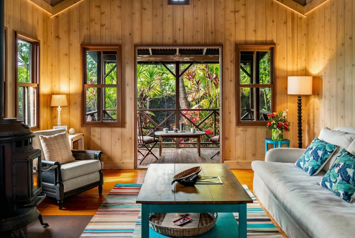 Step into the timeless charm of old Hawai‘i at this handcrafted tropical retreat. Inspired by 1930s island architecture, this home blends natural wood, open-beam ceilings, and modern comforts into a space that feels both elevated and grounded in nature. Wake up to birdsong and fall asleep to the gentle chorus of Coqui frogs. Enjoy your complimentary 100% Kona coffee on the breezy lanai, then take a short stroll to the oceanfront park for breathtaking Pacific sunrises.