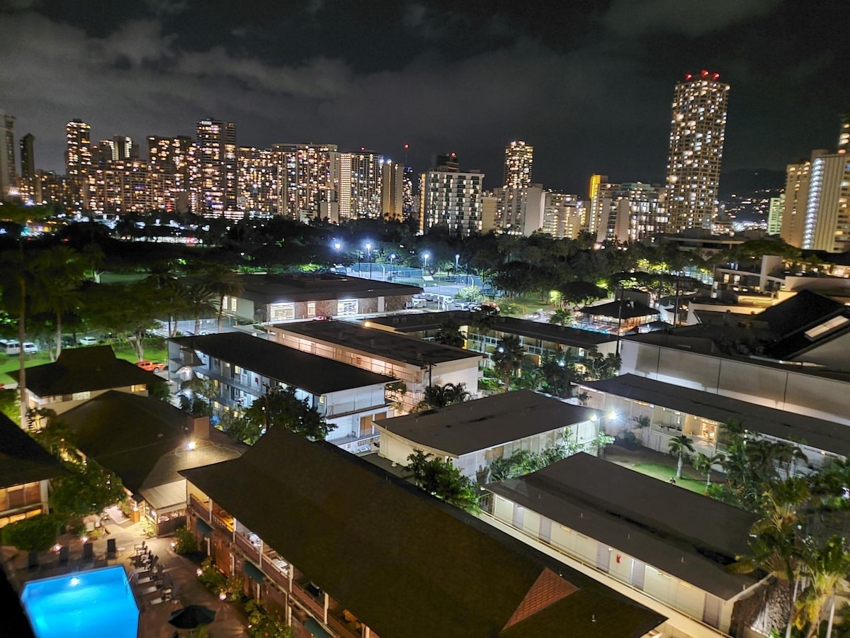 *Aloha! Welcome to the fully renovated studio in Hawaii Monarch Waikiki!* This 259 sq ft studio is the largest in the building, offers: 1 queen bed, 1 twin futon&air mattress; bath; kitchenette and dining bar; 50 inch Samsung TV ; computer desk/monitor; 100Mbps Wifi and beach gears. At 20th floor, strong cellular signal and amazing views: ocean, canal, park, diamond head, mountain, golf, sunrise and RAINBOW! Very convenient, everything is in walking distance.