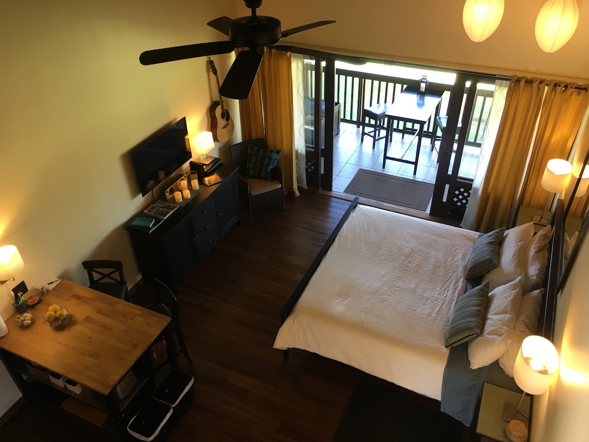 This modern and newly renovated honeymoon beach retreat has breathtaking panoramic ocean and coastline views. Lounge in the daybed while gazing at the sweeping vista from Anini reef to Kilauea Lighthouse. Some have said "it feels like being on a ship at sea" as they witness whales breaching in the ocean and waves peeling on the reef from this magical location. A rare penthouse unit with high ceilings, views from every room, even the famous Bali Hai from the deck. Truly a couple's dream!