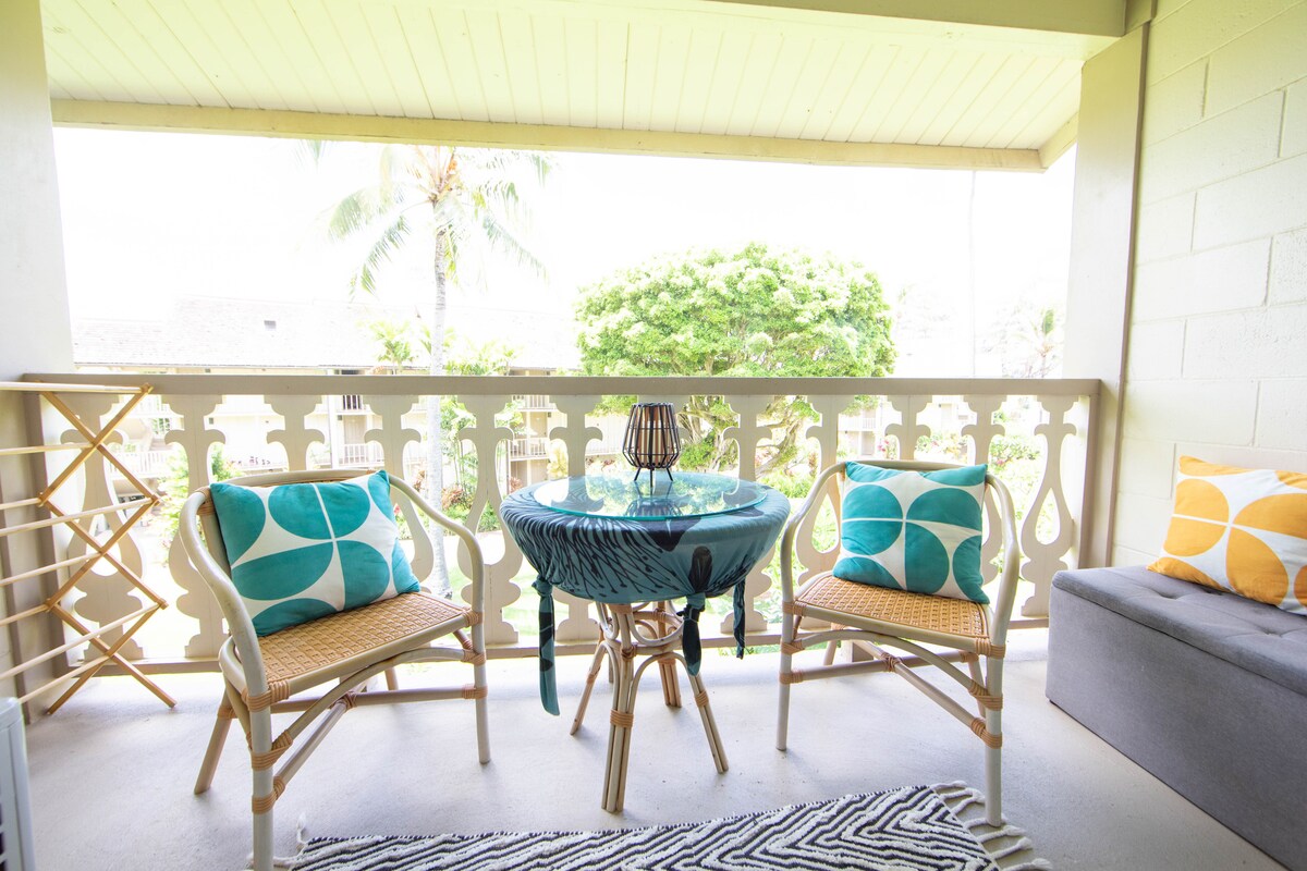 This bright and airy updated condo is the ideal place to stay in sunny Poʻipū for couples, honeymooners + small families. The open living space is clean and welcoming with a coastal boho vibe, and you'll enjoy beautiful ocean + garden views from the huge upper-level lanai. Location is the absolute best - from the beachfront property, you can walk to several of the best beaches on the south shore, local coffee, restaurants, shops, and the incredible pool within minutes.