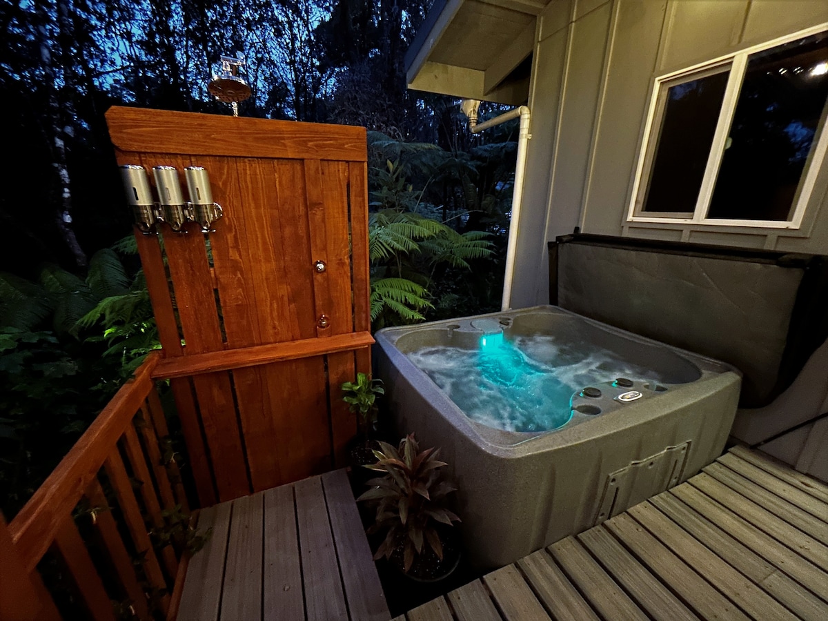 Welcome to Ohia Hideaway - where comfort meets environmental responsibility. Wake up to a room service style breakfast of local fruit and homemade baked goods surrounded by miles of lush native Hawaiian rainforest. Its the perfect place to stargaze and relax in the private hot tub after a day of adventures. Stay put or explore what the quaint Volcano area has to offer. You can spend your days viewing lava fountains, hiking the national park, exploring lava tubes, golfing, or visiting the winery.