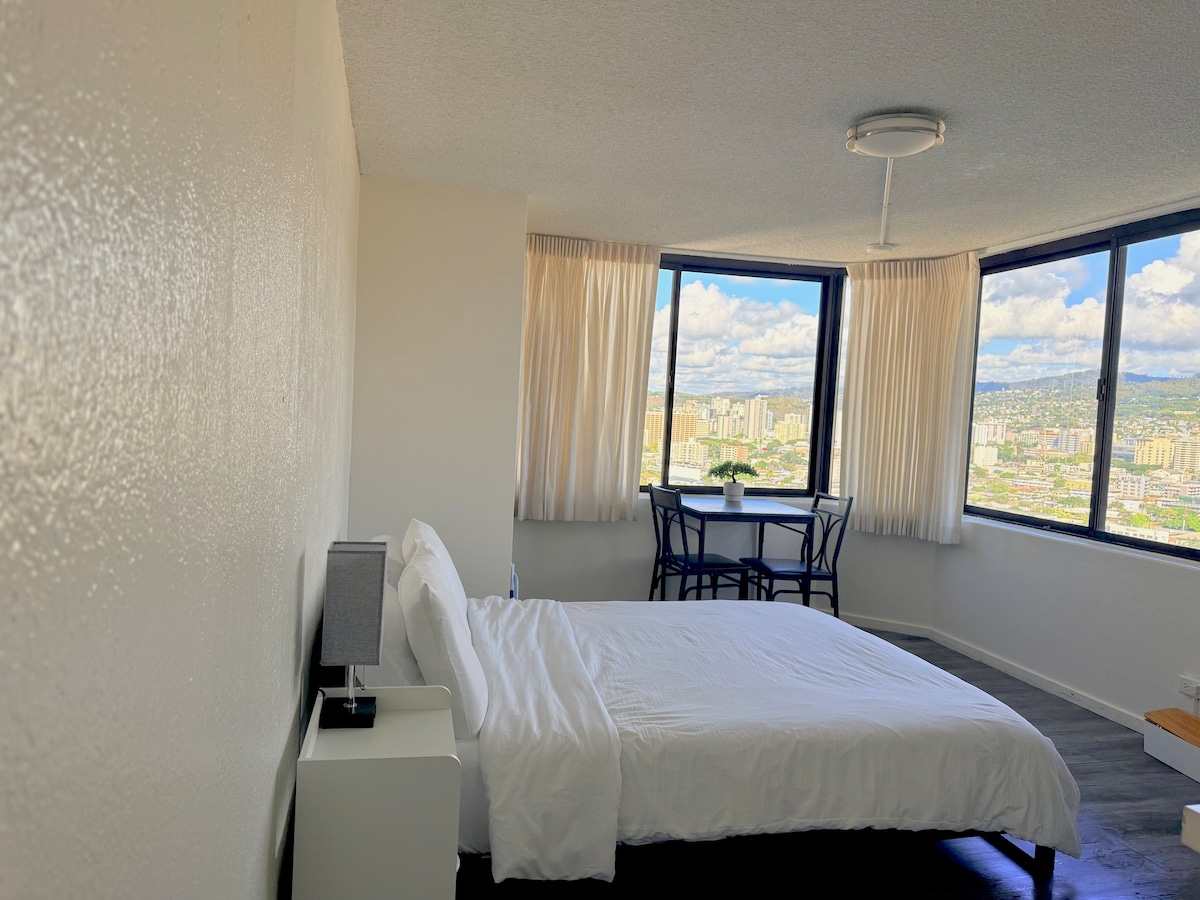 There have a queen size bed, TV, table,home equipped, located high floor, can better view the scenery with sea view. 24 hours security measures, can better protect the safety of residents. Downstairs have convenience stores, restaurants, car rental services, ext. can quickly solve the journey problems . There are parking space in the building, you can choose hourly or daily rent. It’s 45 dollars a day.