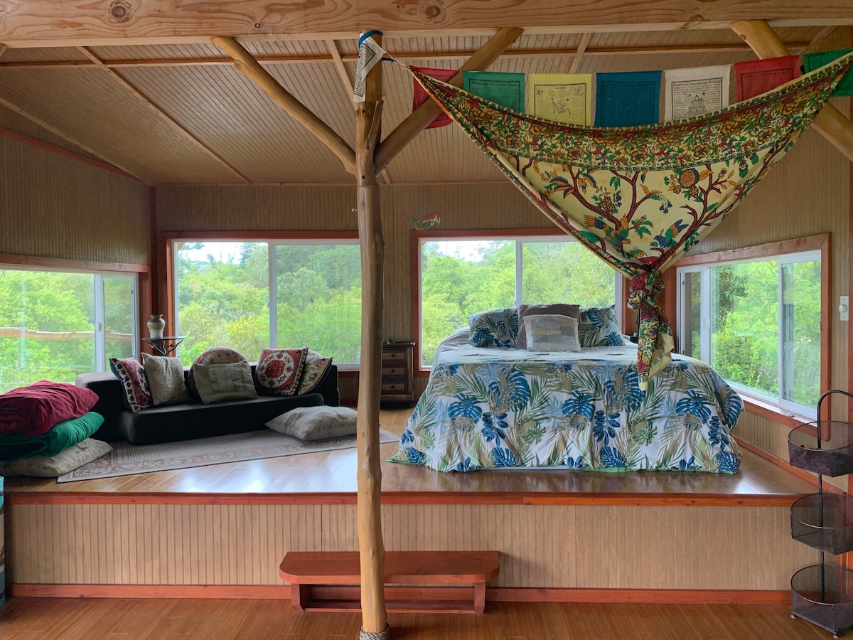 Mauna kea view. 600 feet elevation. First floor queen bed and Sofa. Table. Loft full futon bed. Block out Curtains. Sheets will be changed in a week for a long stay. ☆Hawaii Tax is INCLUDED. Lend beach towels. Morning Coffee & tea provided. We have UV systems for safe water. Washer in main house (Free) Volcano National park40 min west, Mauna kea 1.5 hr northwest, Hilo beaches 30 min east. Additional fee $15 for each person over 2.