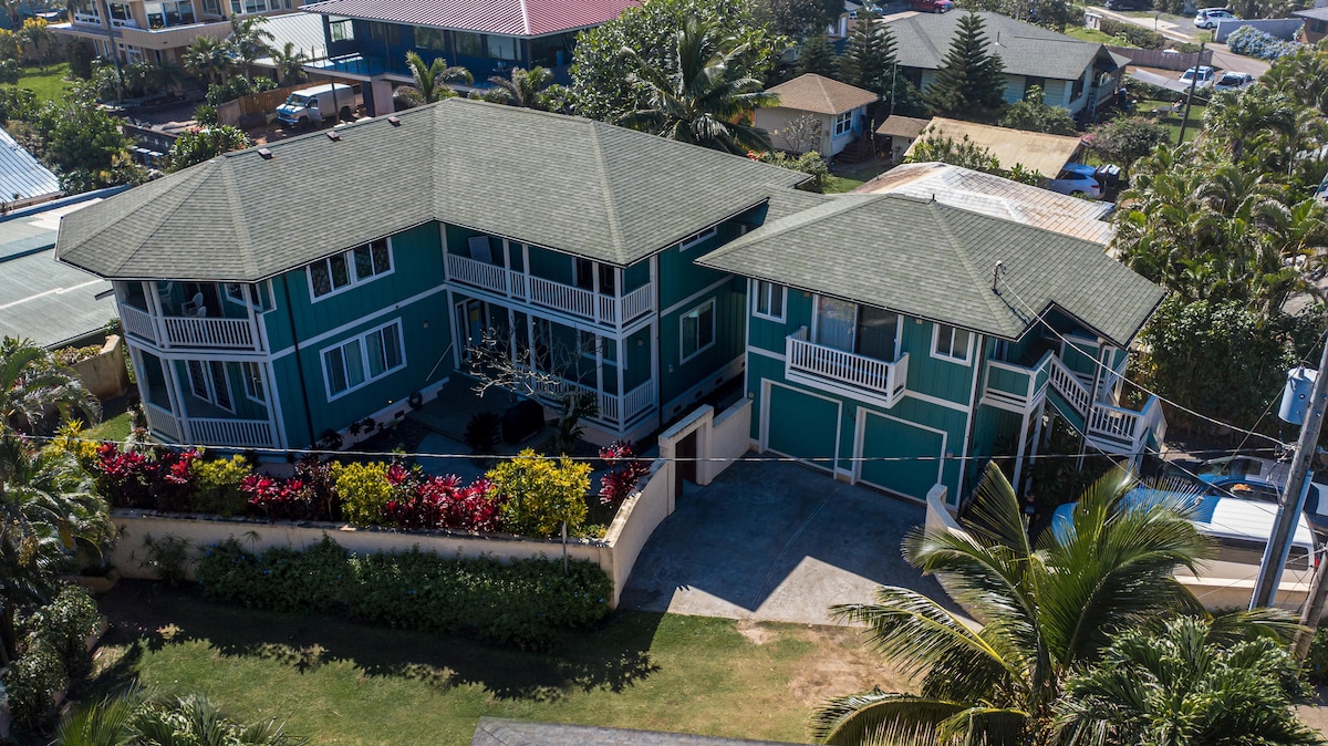 Three bedrooms (1 king, 1 queen, 1 double) all downstairs, and 2 full bathrooms in the heart of Kilauea town. (There is a fourth bedroom with a king size bed upstairs, and you are welcome to use it. I don't count it as a bedroom, because it is a loft bedroom, open on one side.) Drive to white sand beaches in minutes, or walk to restaurants, bakery, and shopping. Rural beauty on the scenic north shore.