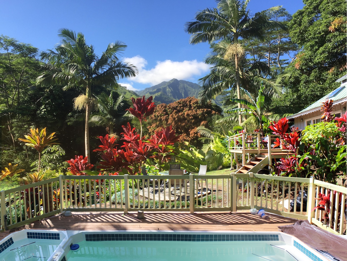 Escape to a secluded romantic haven nestled on an acre of lush gardens in Kauai’s breathtaking Wainiha River Valley. Perched on a bluff with panoramic valley views, this retreat offers tranquility and luxury. Unwind by your private pool and spa, surrounded by vibrant tropical flora, where nature creates an atmosphere of enchantment. Just a short drive away, explore some of the world’s most stunning beaches. Let this serene paradise immerse you in romance and blissful relaxation