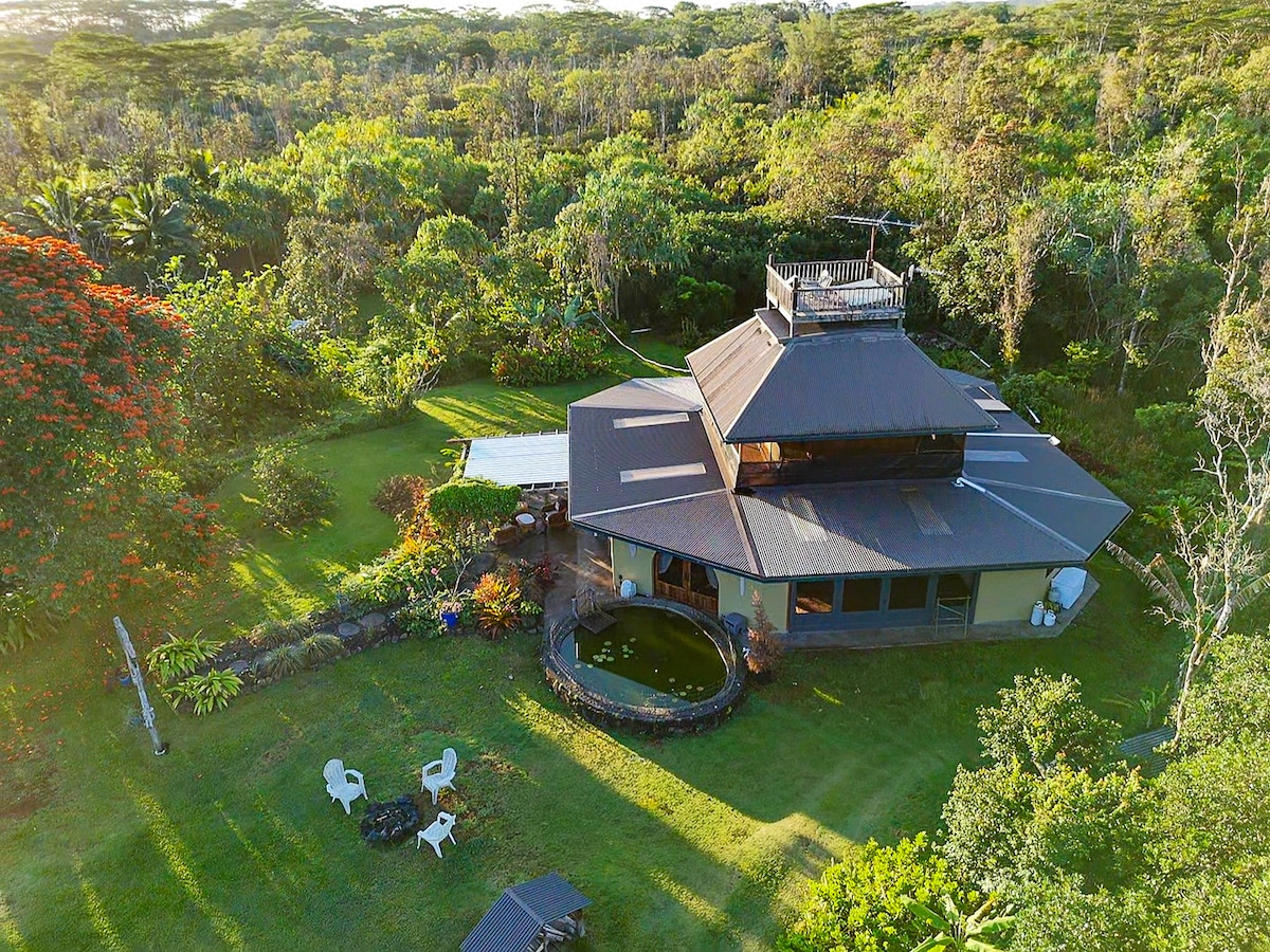 NESTLED🌴 privately amongst towering palms & vibrant tropical foliage, our tranquil suite is perched in a sanctuary of native Ohi'a rainforest EXPLORE🌋 black sand beaches, wild jungles, volcanic hot ponds & Hawai'i Volcanoes National Park ZEN 🎋 daily with nature: dine & relax in the fire pit lounge amidst sights & sounds of the forest on the screened-in lanai REFRESH💦 pristine rainforest offers a harmonizing balance of sun & rain with cooler coastal elevation temperature averages of 83H-65L