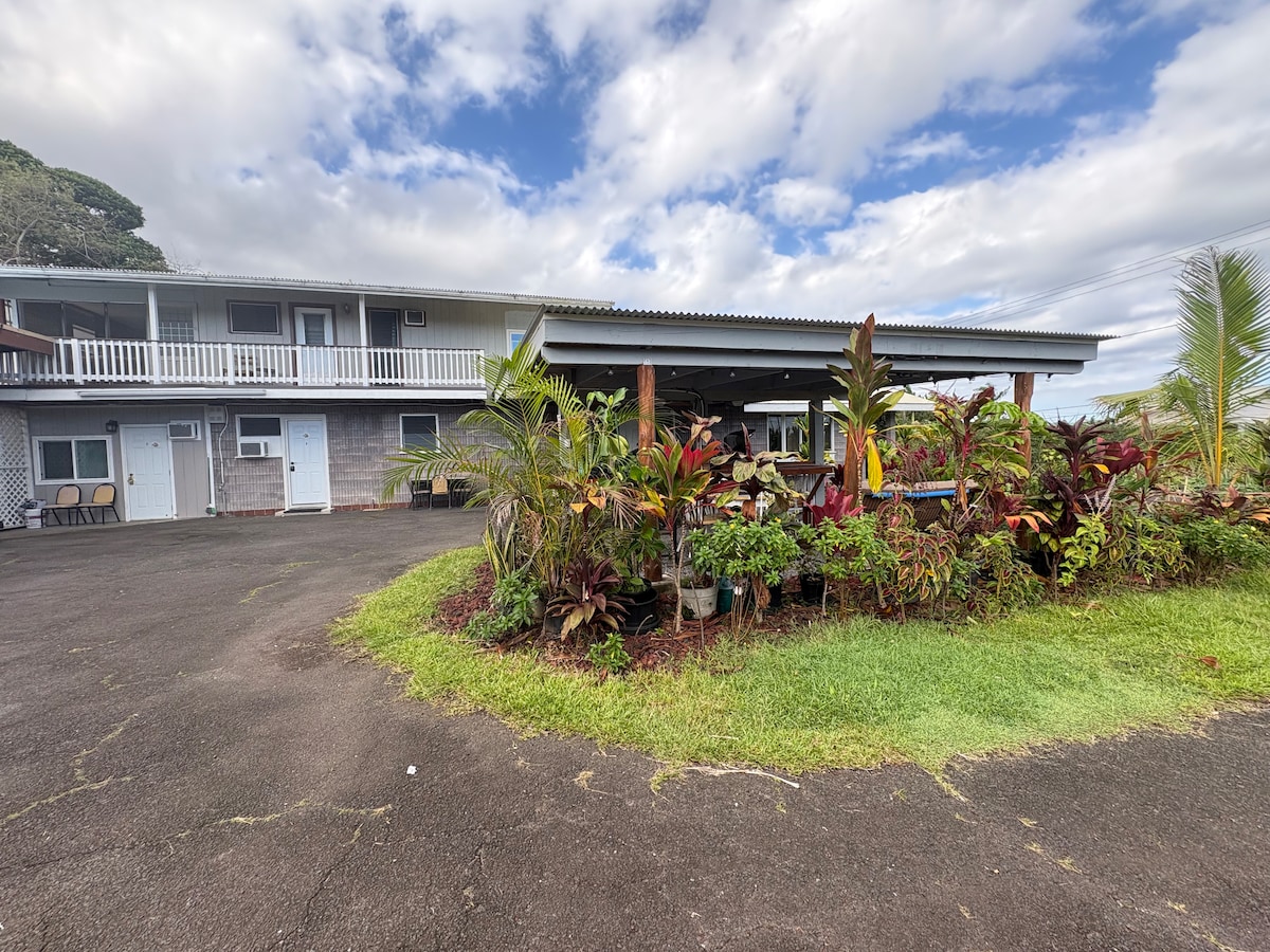 Private Suite has 2 beds: XL Queen & double beds. Private bathroom Private kitchen /dining area is connected to the covered outdoor Lanai. Home is a Custom- built Cape Cod style on a 1 - acre lot in Hawaiian Paradise Park, surrounded by Mother's Nature. We're 2 blocks from beautiful views of ocean / sunrise 1: Paradise Cliffs 2: Maku'u Point 27-minutes drive to Hilo Onekahakaha Beach CarlSmith Beach snorkeling 44-minute drive to Volcano Excellent Wi-Fi Washer & Dryer Available