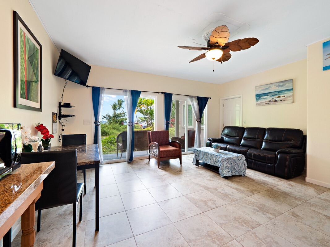 Tropical paradise home near the ocean! Entire upper-level 2 bd (sleeps 4), 1 ba. Private entrance and stairway leading to a fully furnished large lanai with ocean views. Open floor plan, comfortably furnished living room and “open-air” fully equipped kitchen with an island, and a designated desk space. All beds are hand carved mahogany. Newly decorated with natural elements, this home has a coastal theme with a tropical Hawaiian flair, including an outdoor shower.