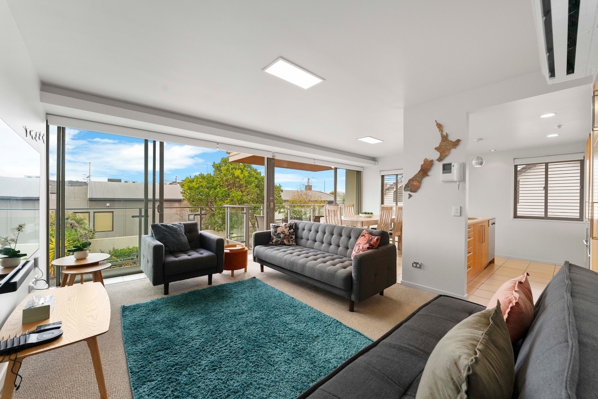 Waimahana apartment 12 is a modern self contained apartment located on the top floor of the complex. The perfect spot for a couple’s getaway. Enjoy the facilities on offer at the complex including the year round heated swimming pool, hot tub, sauna, gymnasium and secure underground carpark . This cozy, modern apartment features a full kitchen, bathroom, living space, bedroom (that can be closed off by a sliding door), and a small balcony that offers a glimpse of the water.