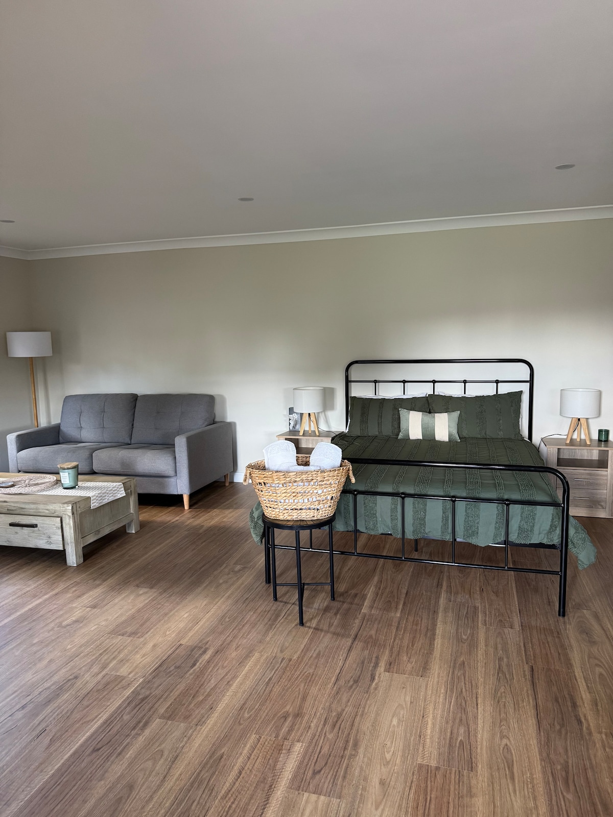 The Milking Shed is a cosy cabin in the lush green hills and beautiful vistas of the Hawkesbury region north-west of Sydney. The cabin is built on the side of a hill and looks directly into a small forest of eucalypts - perfect for trying to spot one of our regular koala visitors. It is 200m past the main house on the property, and completely private. Curl up with a book, feed a donkey, pour a wine, cuddle a corgi, or sit on the deck take in the country. It is a million miles from care.