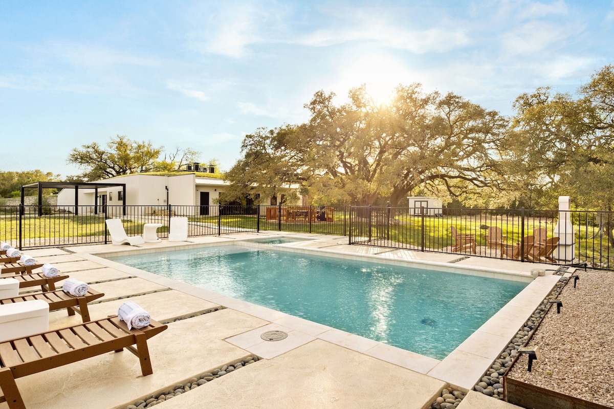 Beautiful rustic “Hill Country Modern” home on five acres with a view of our seasonal pond and the valley. My home incorporates the use of outdoor living space unlike any other. The patio and breezeway are integral parts of the usable space. One side of Sunrise House has a large living room with a fireplace and huge windows. The house has top-of-the-line fixtures and finishes, a mix of new and curated furniture and decor, and beautiful custom art.