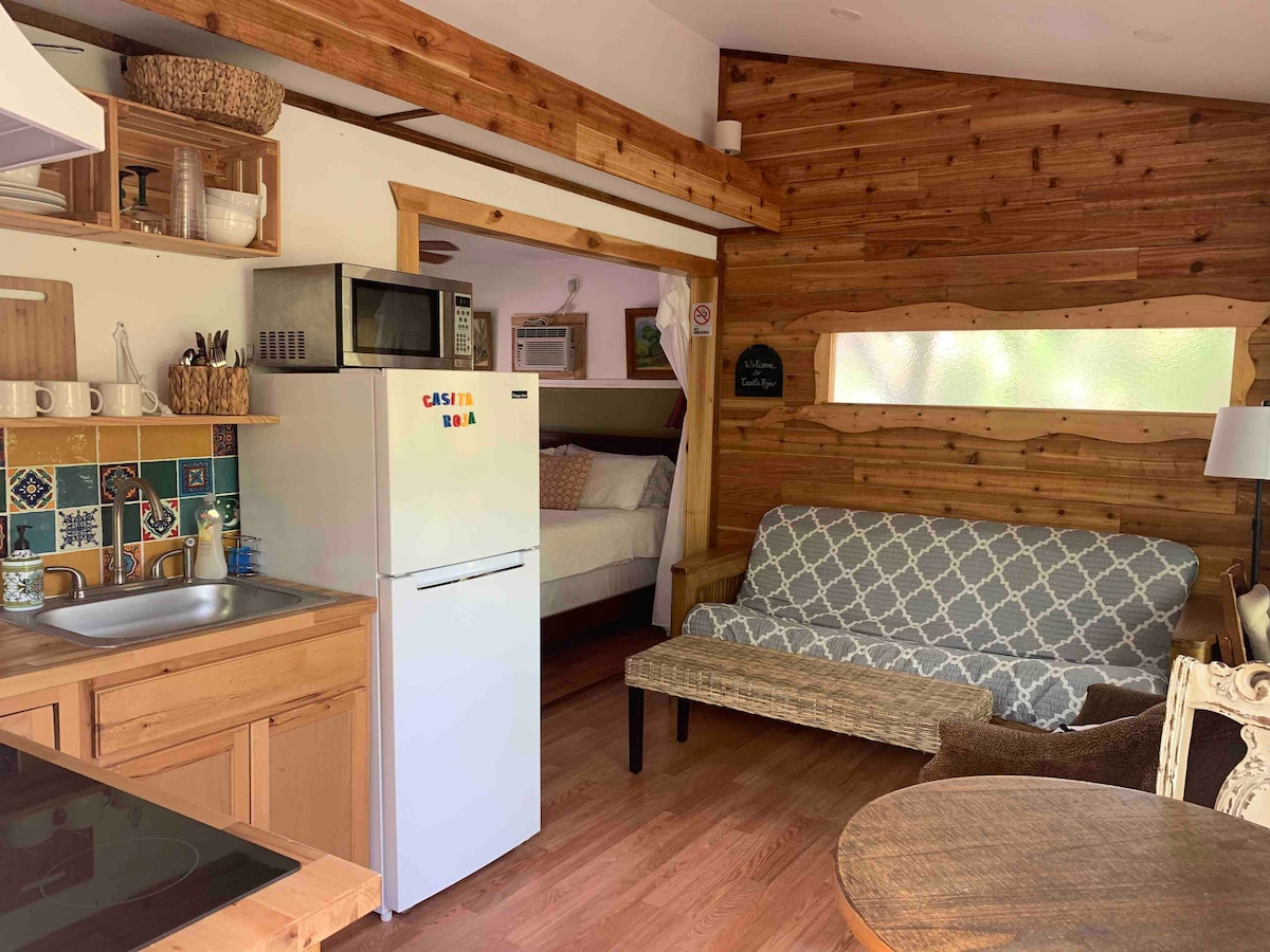 As seen on HGTV! "My Tiny Cabin" is a complete house in 288 square feet, built as an experiment in simplification by CJ "Ceige" Taylor, situated under oak trees on a 1.5-acre working neighborhood mini-farm. Stay in a real Tiny House on Wheels while you visit nearby Driftwood or Dripping Springs, drive into Austin or San Marcos, or enjoy the Texas Whiskey Trail (Crowded Barrel, Fang & Feather), wedding venues (Chapel Dulcinea, Tuscan Hall), the Wizard Academy, Radha Madhav Dham, and more.