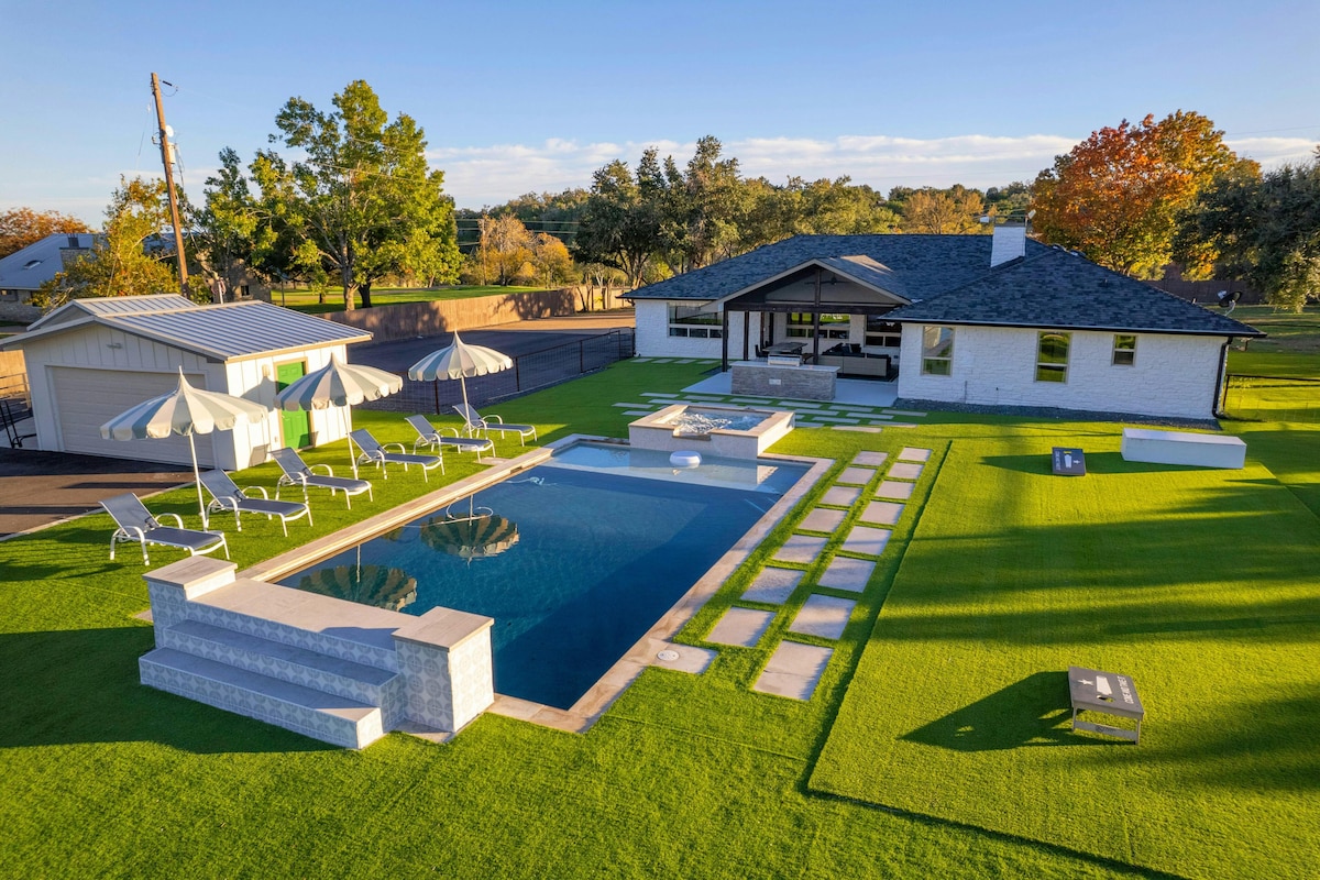 🏠 Designer home in the Texas Hill Country, offering vaulted ceilings, walls of windows, and natural light to create a stunning private retreat. Relax in the 8-ft hot tub, swim in the 35-ft private pool, or indulge in movie nights in the private theater. Minutes from top wedding venues, wineries, breweries, BBQ joints, and nestled behind a serene nature preserve. ★ "An unforgettable escape—perfect for families, corporate groups, or wedding guests seeking comfort and style in the Hill Country!"