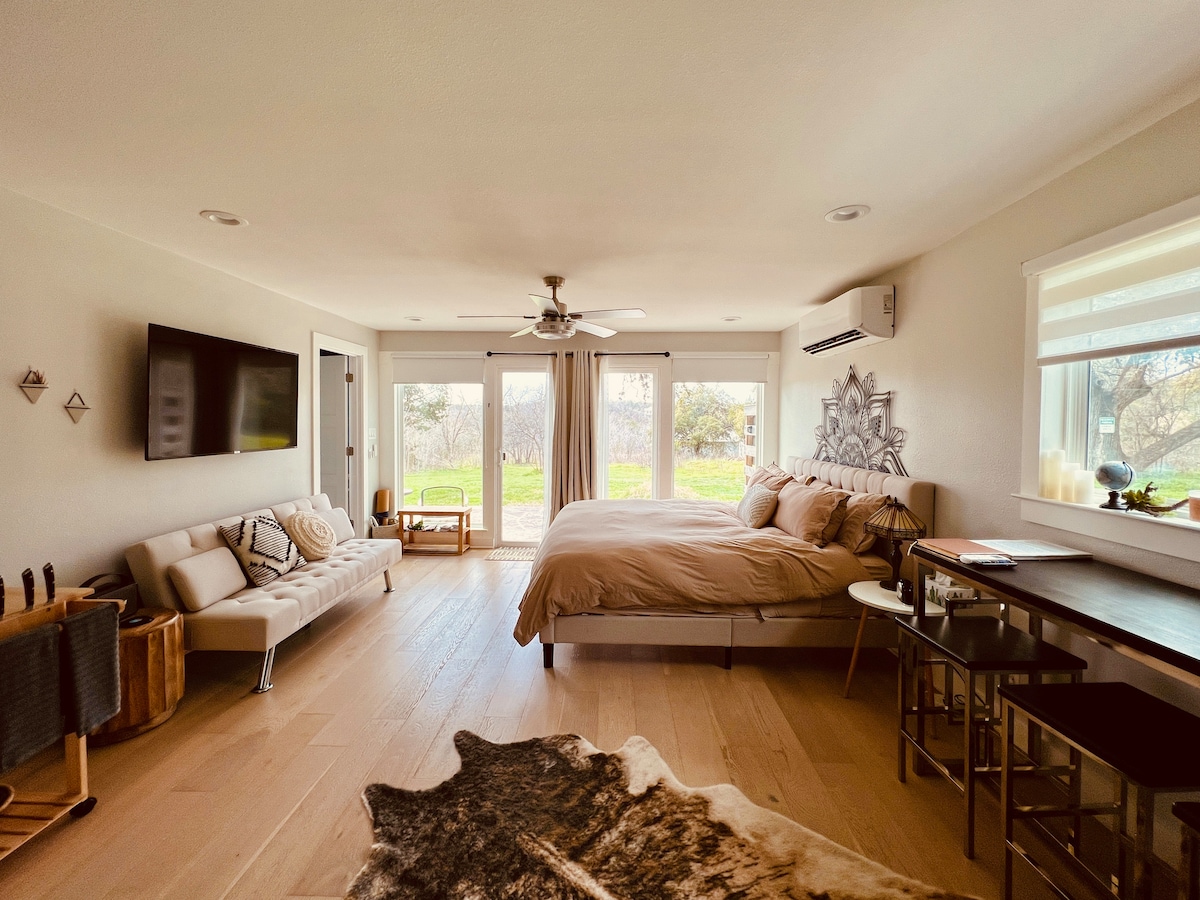 Like a high-end hotel room, this well-appointed suite with small kitchen on unique 10-acre urban ranch is situated in the middle of bustling South Austin. Enjoy stunning sunsets over the hills through a wall of windows or from your private patio. Fantastic birdwatching, wildflowers, and deer sightings on the property. Perfect for those looking for an inspiring retreat with the conveniences of the city. You won't believe you're only 15 minutes from downtown Austin! Age 25+
