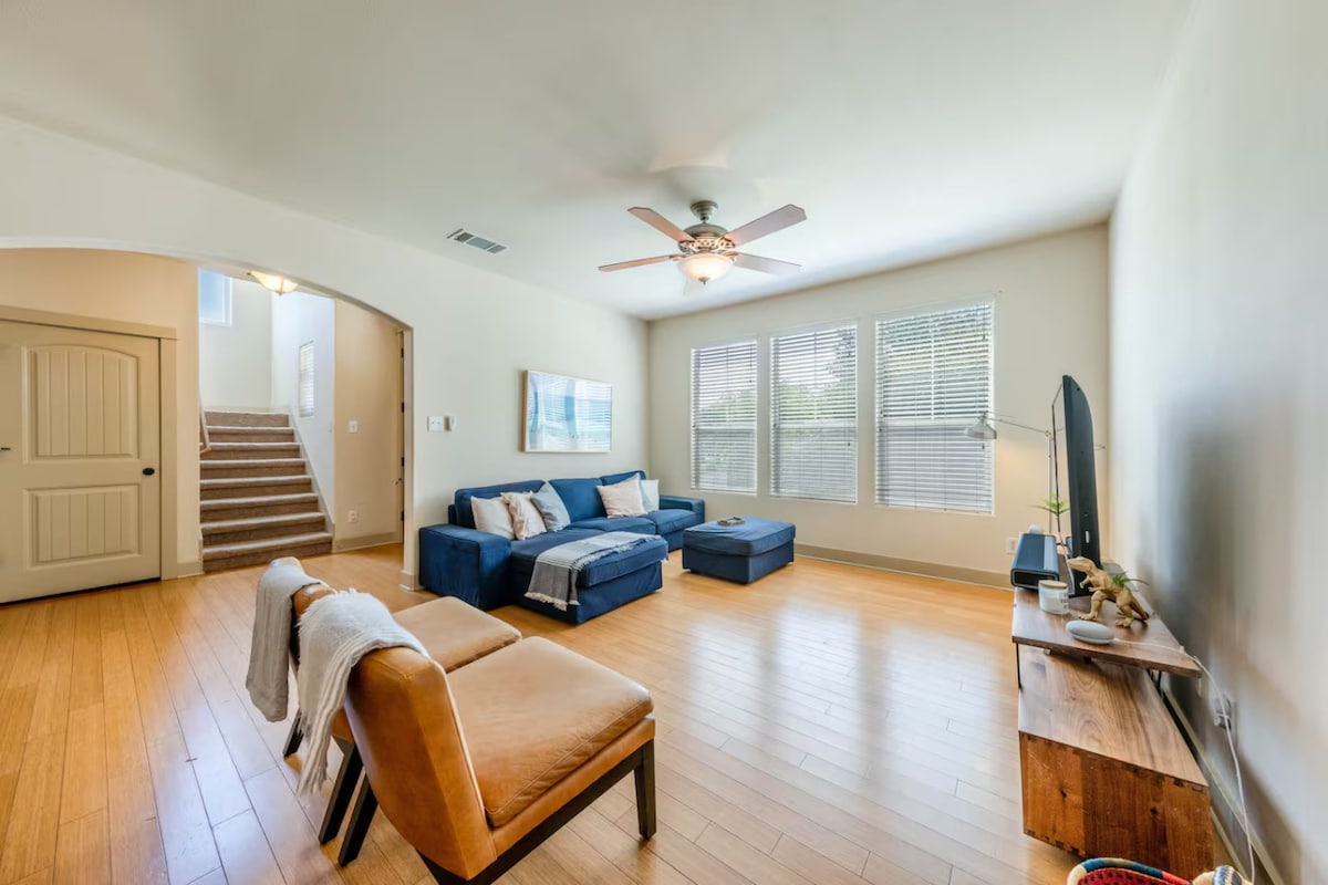 This 2,000 square foot new home on a corner lot is the perfect vacation rental spot for Austin, TX. Even though it’s a 15 minute walk from east 6th st. and all the best parts of social and music Austin, it’s nestled away in a peaceful neighborhood across the street from beautiful Rosewood Park. This 3 bedroom, 2.5 bath house has amazing views of the Austin sunrise. The rooms are spacious and the sleeping arrangements luxurious: 1 king size bed in the primary and 2 queens in the guest rooms.