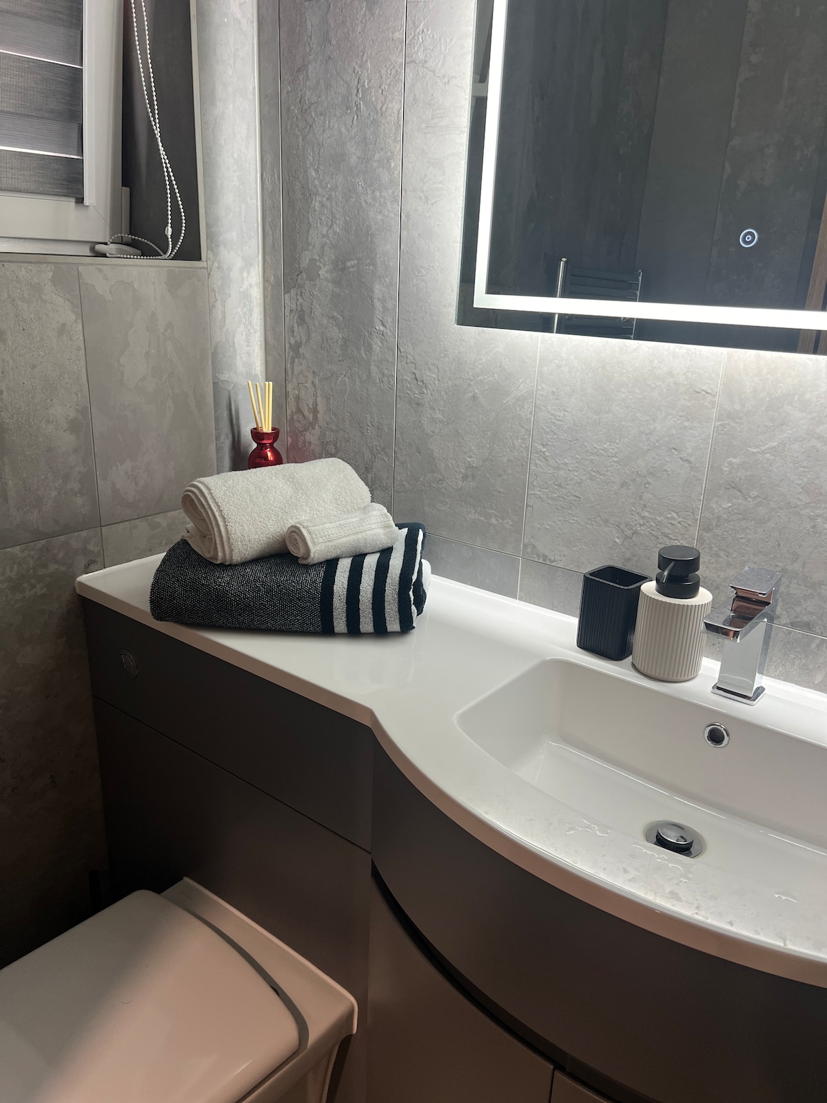 The basement flat is small but ideal for short stays. Steep stairs down, not suitable for mobility problems. Empty the day before guests arrive and the cleaning is thorough. The kitchen has a microwave/oven/grill, fridge, hob, kettle and most things you will need. There is a dining table,2 chairs and a sofa bed for one person Shower-room has shower,washbasin, toilet,towel rail radiator. Bedroom has a Standard Double bed, reading lights, drawer space, clothes rail, full-sized mirror, hairdryer