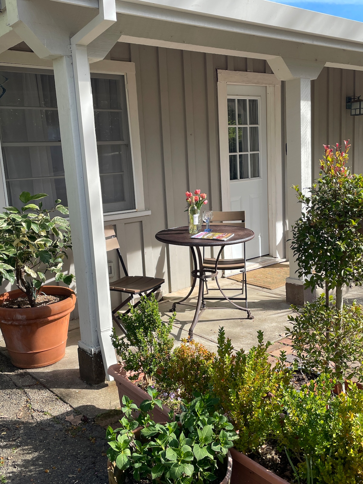 Relax at our renovated private guesthouse a 5 min drive (1 mi) from the Healdsburg Plaza. Updated 2 br/ 1 ba home with private yard and outdoor dining and lounge areas. Our layout is ideal for one family or close friends traveling together as the one bathroom is accessed through the primary bedroom. Perfect for a wine country getaway- convenient location just outside of Healdsburg city limits in a vineyard adjacent neighborhood. We love kids and welcome them! Permit #TVR22-0119