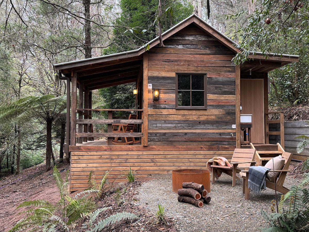 Originally featured in the award-winning 'A Moment in Time' garden — People’s Choice and Silver Winner at the 2024 Melbourne International Flower and Garden Show — this rustic hut captured hearts with its simple design and moving story. Now reimagined as an immersive stay in an enchanting 10-acre temperate rainforest, it sits among tall mountain ash and lush ferns on the Black Spur in Victoria’s Yarra Ranges — a region of beauty, winding roads, and hidden adventures.