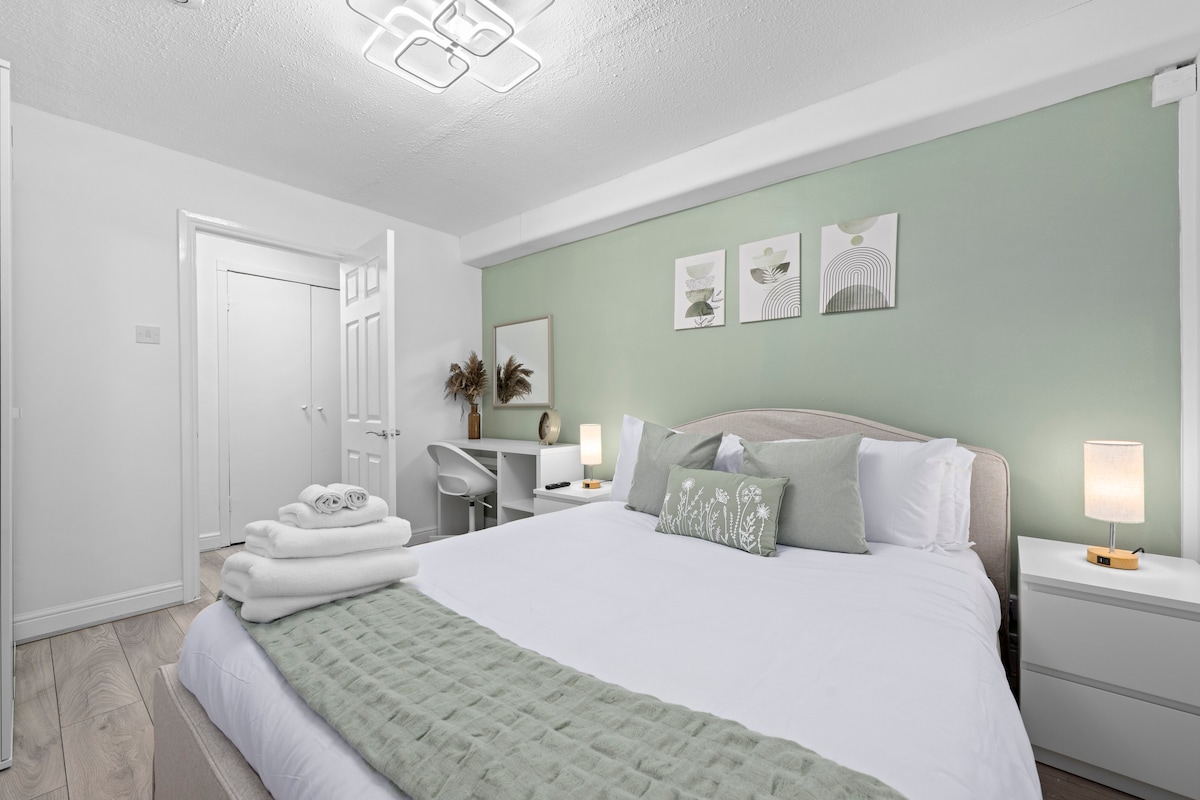 Stylish 2-bedroom ground-floor apartment on a very quiet street in Salford, just a 15-minute drive to Manchester city centre and only a 3-minute walk to the bus stop, Lidl, and local shops. Also only 20 min walk from famous Heaton park.Fully equipped with all essentials, perfect for families with a cot and high chair for toddlers. Bedroom 1 has a king bed, Bedroom 2 a single bed, and the sofa in the lounge converts for a 4th guest. Includes two TVs and a work desk for leisure or business stays.