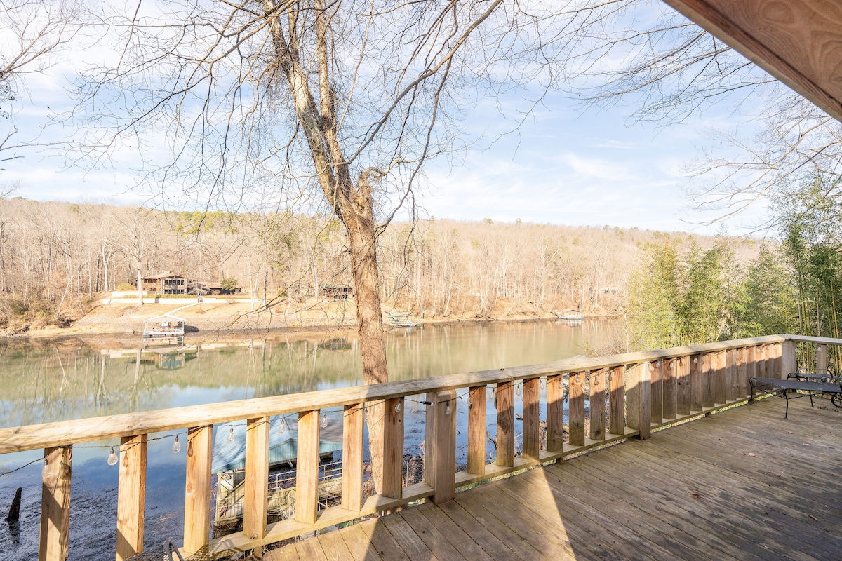 Great lake retreat with a large covered and uncovered deck space for relaxation and star gazing. Lake house sits on a flat 2.5 acre lot with private access to expansive rock point for swimming, fishing and sitting and relaxing with the lake all around you. Master suite: king bed and 20 ft ceilings; Guest room: one bunkbed and one queen bed and TV with DVD player. Cozy living room and kitchen, wood burning fireplace, SmartTV. Good cell signal, wifi, and fire pits for s'more roasting!