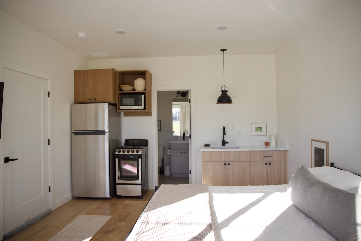 A small luxury studio apartment inside a rustic old horse barn. The Midway Farm Barn used to be the home of a racehorse breeding business and now is a peaceful escape from city life. Enjoy the comfort of a stylish apartment while appreciating the sounds of animals and nature. The perfect mix of old and new and a great way to relax, reenergize and be inspired. Walkable to town and close to skiing, the Homestead Crater, Soldier Hollow, lakes and more.