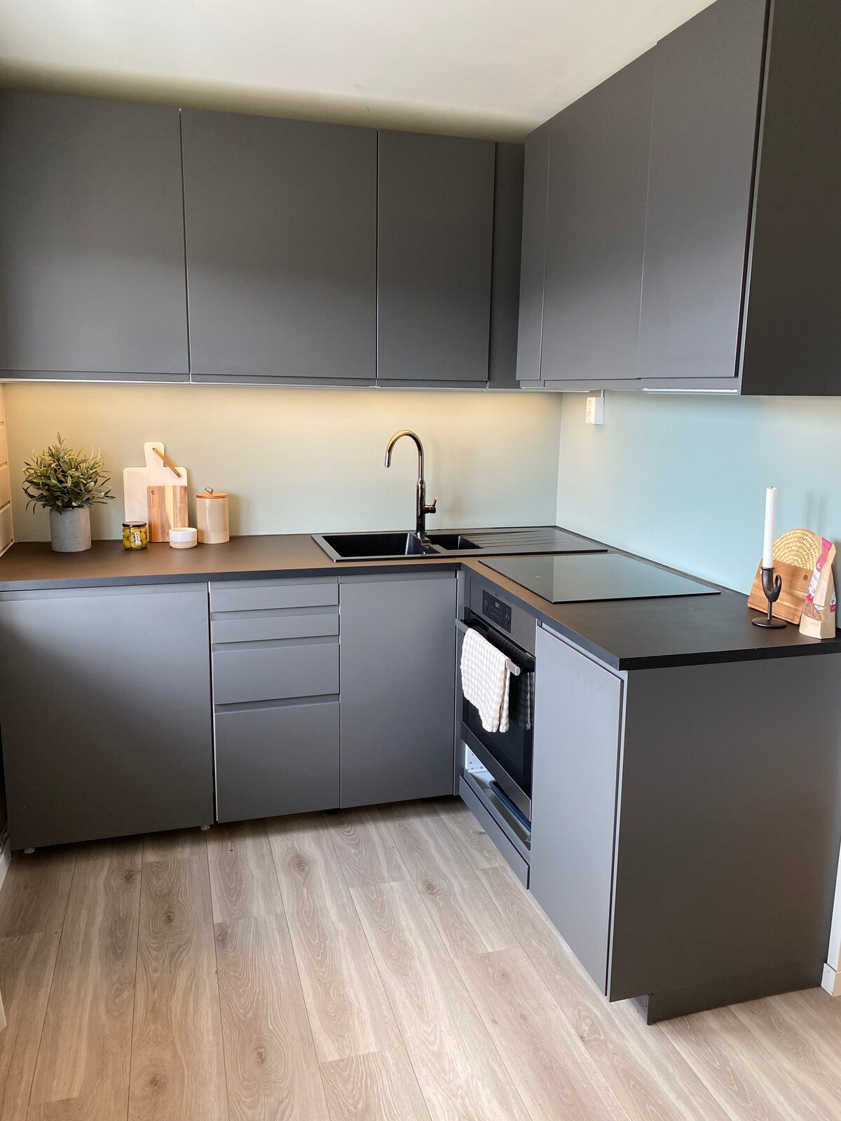Your perfect romantic getaway at FURU Norway A sheltered south-west facing cabin surrounded by evergreen trees creating an intimate setting. Interior in a dark color scheme, restful like long winter nights. Enjoy your private forest hot tub for 500 NOK per stay, book in advance. Floor to ceiling windows with black-out curtains, underfloor heating. King-size bed, kitchenette with 2-plate cooktop, high quality tableware, comfortable seating area. Bathroom with Rainshower, sink and WC.
