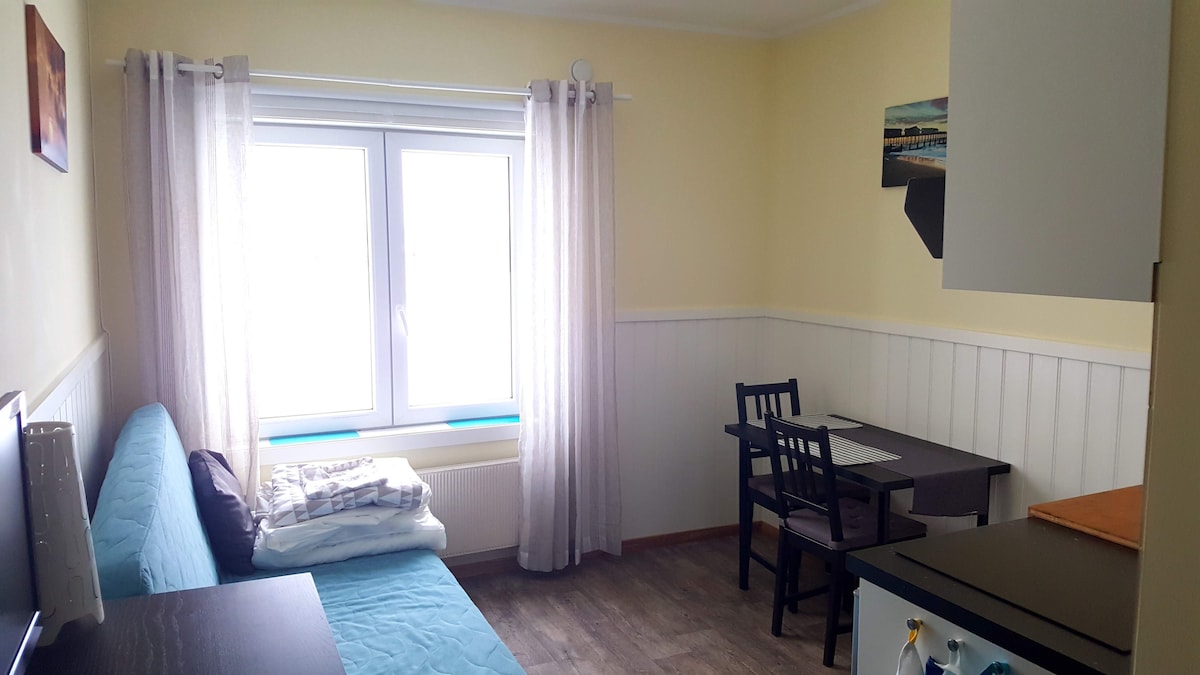 Your private serviced apartment is equipped with bathroom and kitchenette. Fully furnished with bed, utensils, hotplates, microwave oven, refrigerator/freezer unit, TV, sheets and towels. Parking. WiFi + LAN. Shared garden and laundry room etc. Well insulated. We can adjust furniture and services for guests staying longer.