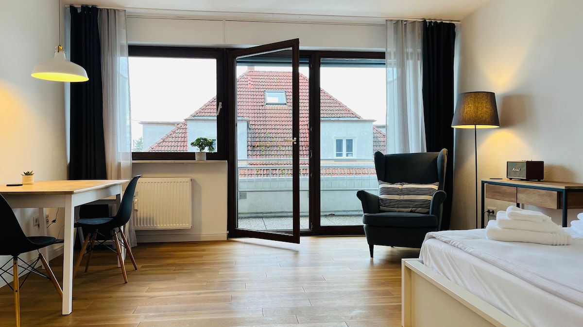 This stylish and completly furnished, one-room apartment with private bathroom and kitchen is quietly located in the middle of Heidelberg's historic center. The main room has a 160x200 cm bed, storage space, a sofa and a work station. The kitchen is fully equipped, in the bathroom there is a washing machine. A large balcony facing the courtyard extends over the length of the apartment. In the area there is everything for daily needs: supermarket, bakery, pharmacy, bars, cafes, restaurants,...