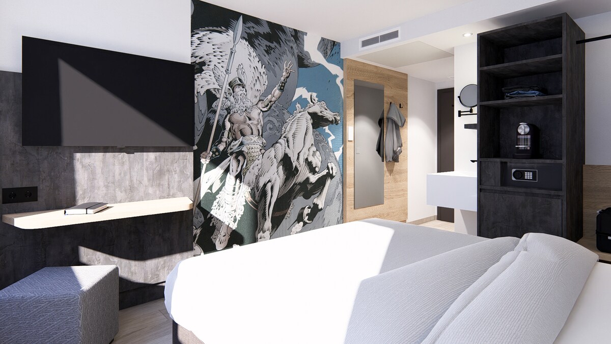 This comfort double room covers 22 m² and features a large double bed (2 x 2 m). It is equipped with free Wi-Fi, a flat-screen TV, cable channels, a desk, a phone, and a wardrobe. The private bathroom offers a shower, toilet, and towels. Additional features include wooden or parquet floors, bed linen, a power outlet near the bed, heating, and hypoallergenic amenities. Smoking is not permitted in this room.